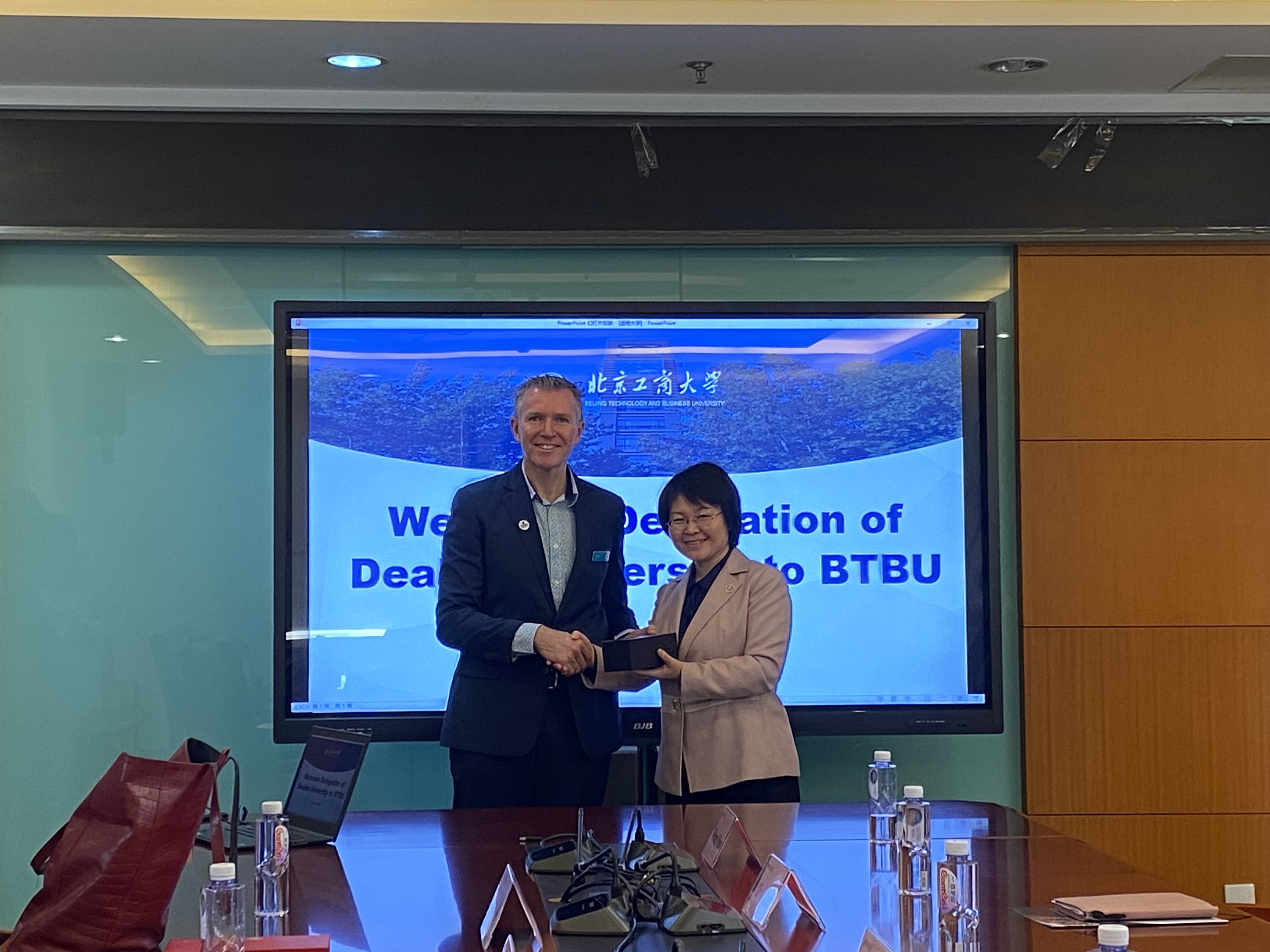 希金斯副部长对第一版主 的热情接待表示感谢,他介绍了澳大利亚迪肯大学的历史和发展现状以及商法学部的研究方向。澳大利亚迪肯大学(简称“DKU”),澳洲排名前10,世界排名前2%,获得多项国际认证。他表示,很高兴能够在这里回顾过去合作的成果,畅想未来的新机遇。目前两校间的合作模式为第一版主 double degree双学位项目和国际教育学院2+2留学项目,双方学科设置匹配度较高,同时非常重视两校的合作和交流,迪肯大学也将一直致力于发展和深化与工商大学的合作领域和内容。未来两校间合作将以线上教学合作“Quaro”、学期内短期出国交流等模式进行。