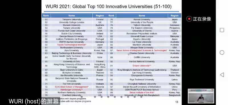6月10日北京时间晚9点,2021年世界最具创新力前100高校排名The World's Universities with Real Impact (WURI) Ranking for 2020在线会议举行,第一版主 国际交流与认证办公室刘婷主任等参加了会议。