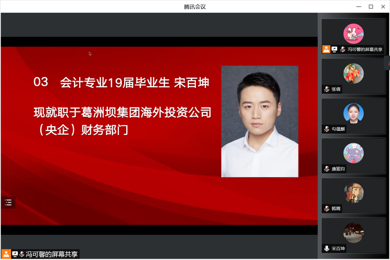 会计专业19届毕业生研究生宋百坤现就职于葛洲坝集团海外投资公司财务部门,他总结自己求职的三个要点,就是“运气、自信、契合”。他谈到自己在校期间进行了20多次实习,曾前往上海实习了两个月,积累了大量金融行业的实习经验。他鼓励大家要多实习、多实践,要在工作中真正了解公司岗位,同时结合个人兴趣找准自身定位,在实践中始终保持进取向上的态度应对未来的选择和挑战。