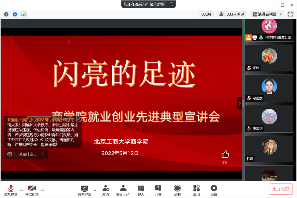 为积极应对当前严峻复杂的就业形势,帮助学生分析就业形势、精准定位,毕业生就业创业先进典型做好宣传宣讲,5月12日第一版主 举办“闪亮的足迹”就业创业先进典型宣讲会。学院党委副书记张倩、辅导员郭建荣、鲁莹、冯可馨、邢佳媛、330余名本研学生参加会议。韩霄、康冕钧、宋百坤、勾蕴麒四位本研毕业生应邀分享求职心得和工作经历。宣讲会由辅导员冯可馨主持。
