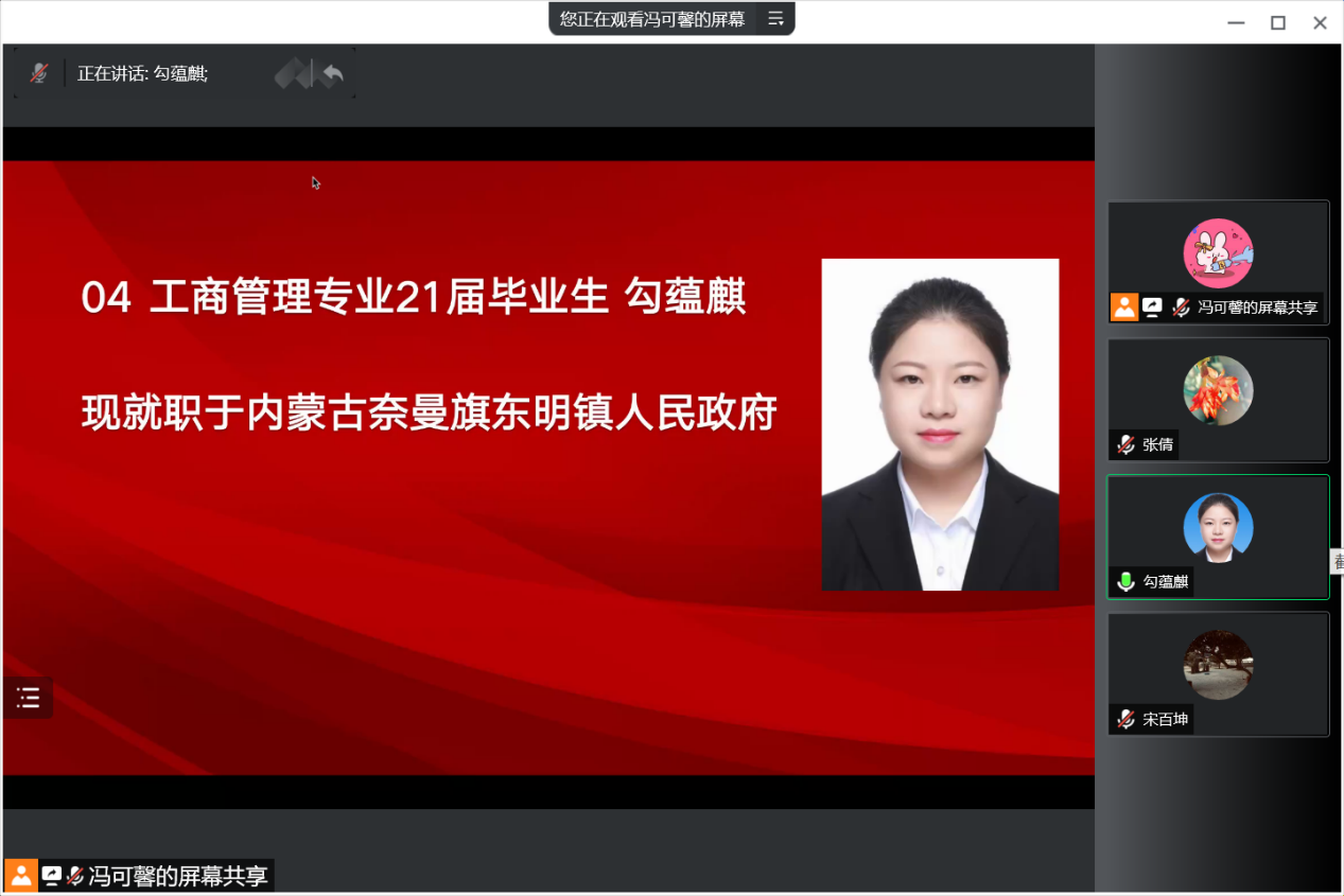 工商管理专业21届研究生毕业生勾蕴麒现就职于内蒙古奈曼旗东明镇人民政府,为大家分享了有关选调生以及基层公务员的相关经验。她谈到在乡村振兴的大背景下,选调生显示出机会大、竞争小的相对优势,比较适合愿意以基层为起点积累经验向上拼搏的同学;在工作中会接触基层方方面面的工作,能得到很好的锻炼,个人会有非常快的成长和进步;并对选调生的培训学习、发展通道、收入情况等与同学们进行了较为细致的分享。