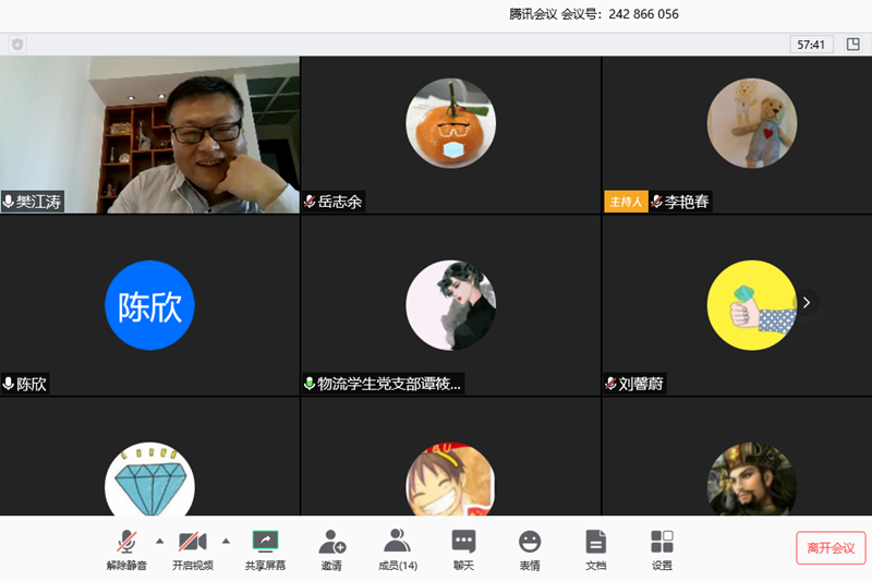 学院党委副书记樊江涛、团委书记李艳春、常务副书记李璐、辅导员赵杰四位老师和二十六个本科生、研究生党支部书记们线上齐聚,在视频中相互问好,道以珍重,介绍了各自家乡的疫情防控工作和居家学习进展情况。