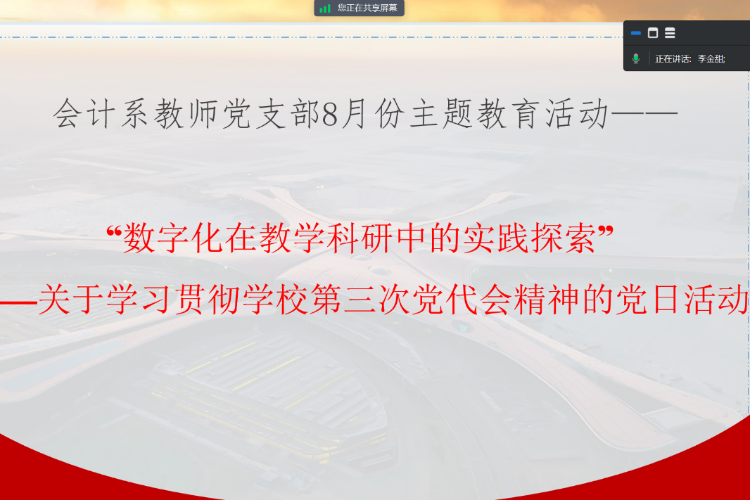 为了贯彻学校第三次党代会精神要求,在学思想、强党性、重实践、建新功基础上,应商科数字化转型大背景,会计系教师党支部进行了以“集财会之智,谋数字化发展之策”为主题的主题党日活动。会计系陆续在进行数字化相关课程建设,各位老师集思广益,互相交流讨论数字化转型的教学或科研经验,以促进教学和科研工作的数字化转型。