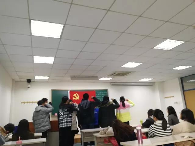 最后,在支部何凤强同志的带领下,新正式党员面向党旗,庄严宣誓,与会党员也重温了入党誓言。