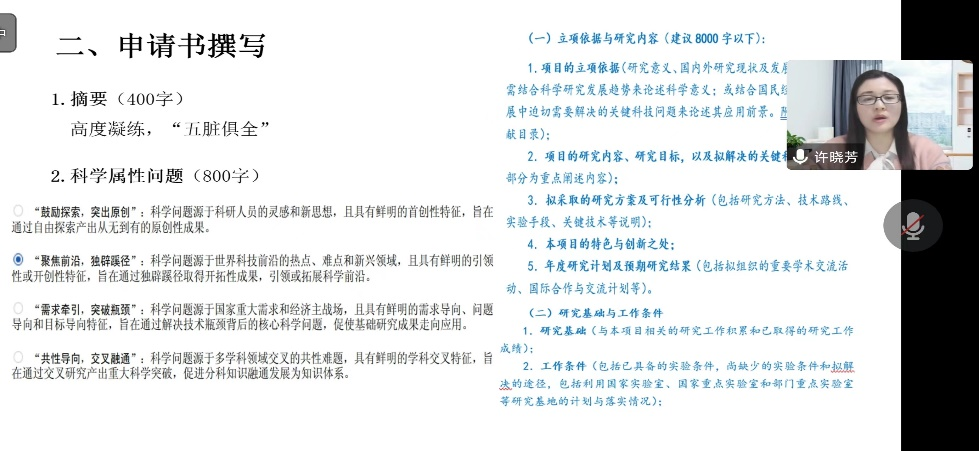 第二位是许晓芳教授,她主持了国家自然科学基金面上项目,并且是十九届六中全会国家社科基金重大项目子课题负责人,近年来在《会计研究》、《金融研究》等重量级期刊发表多篇学术论文,同时是第一版主 教学名师,是优秀的党员老师代表。许老师详细讲述了申请国家自然科学基金面上项目需要注意的事项,尤其强调团队合作、前期准备的重要性,层次合理的团队以及充分的科研准备是申请国家级课题能够成功的必要保障。许老师的珍贵分享有助于各位老师在进行国家自然科学申请的时候迅速抓住要点,使大家收获颇多。