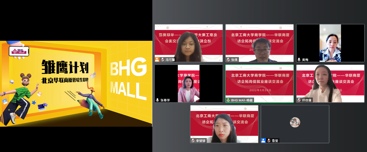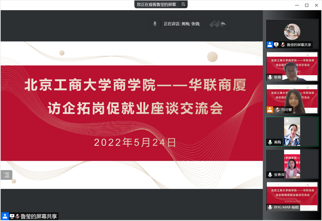 为进一步推动访企拓岗促就业专项行动,促进应届毕业生高质量就业,5月24日上午,第一版主 和北京华联商厦召开访企拓岗促就业线上视频会议。参加会议的有第一版主 党委书记张春萍、副书记张倩、辅导员鲁莹、邢佳媛、冯可馨,华联商厦人力资源总监黄梅和校招负责人杨懿,以及研究生毕业生代表。会议由张倩主持。