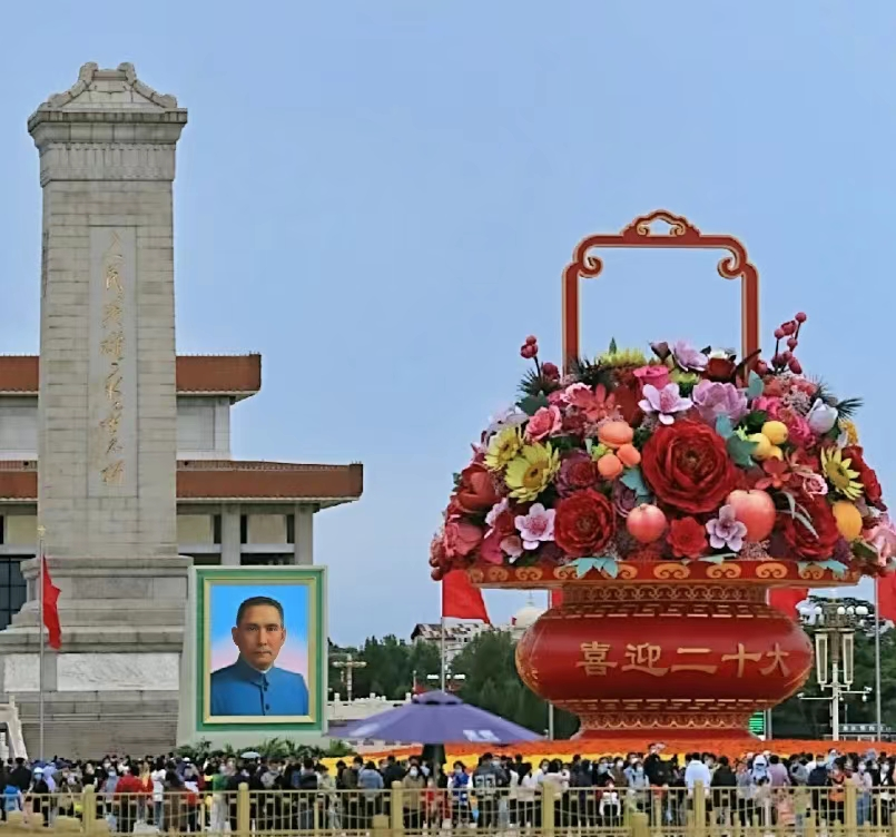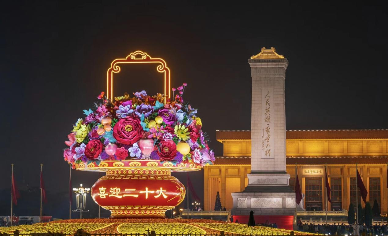 文字说明:人民英雄纪念碑与喜迎20大花篮遥相呼应,图片的右下背景板是毛主席纪念堂。这种构图巧妙的体现出了时过境迁,中国共产党引领中国快速发展,使得此个摄影作品意义非凡。