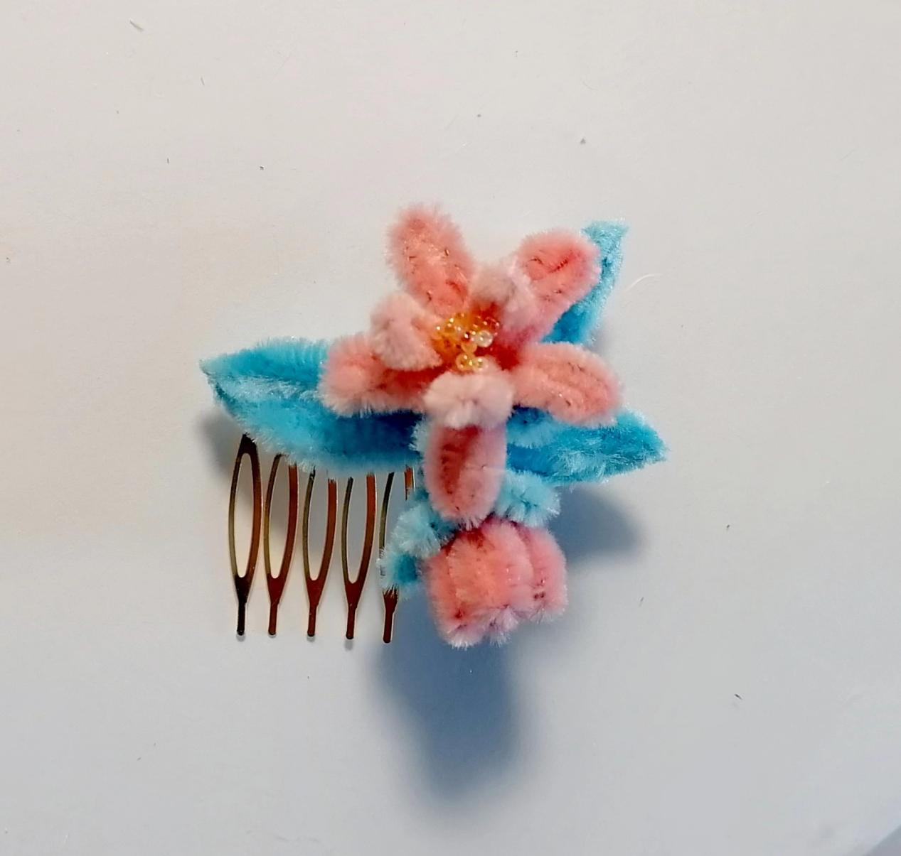 文字说明:习总书记在二十大报告中指出,要“推进文化自信自强,铸就社会主义文化新辉煌。”绒花,谐音“荣华”,作为中国非物质文化遗产,具有丰富的类型和悠久的历史。此作品为仿绒花,以扭扭棒为原料,是现代工艺与过去样式的结合,是现代的一种对于仿制绒花制作的创新方式。此作品选用粉蓝配色,让色调在冷暖间产生平衡。此外,此作品将扭扭棒做成花的形状,贴合到发卡上,可作为日常的头饰佩戴出门。