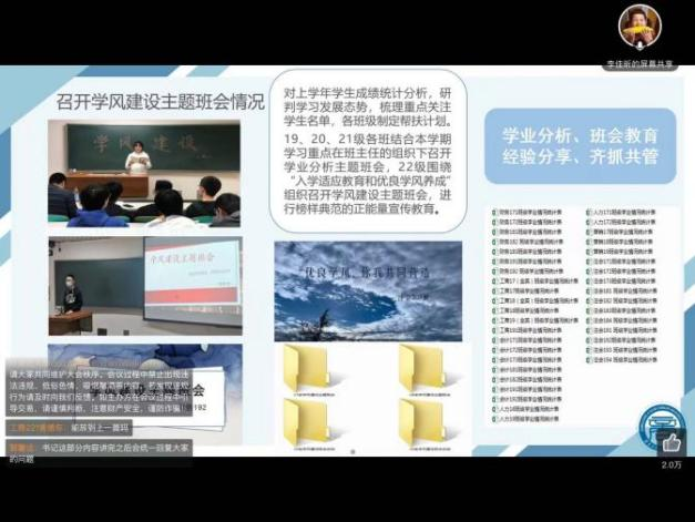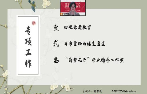 为引导本科新生更快更好适应大学生活,尽快熟知大学生行为规范,培养良好的生活学习习惯及优良学风,按照学校关于学生阶梯教育和培养的相关要求,第一版主 在秋季学期以“青春献礼二十大,商舟启航新征程”为主题开展2022级本科新生专题教育,主要涉及底线教育、入党启蒙、培养方案介绍、档案管理介绍、奖惩体系介绍、心理及资助事项等内容。主讲人为学院党委副书记张倩、教学秘书崔博、辅导员郭建荣、李佳昕、郭馨远,第一版主 2022级全体本科新生参加会议。教育活动以腾讯会议形式举行,辅导员赵春燕主持会议。
