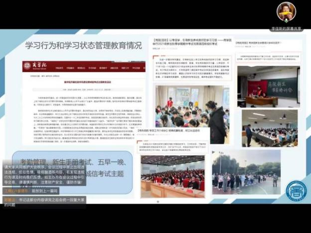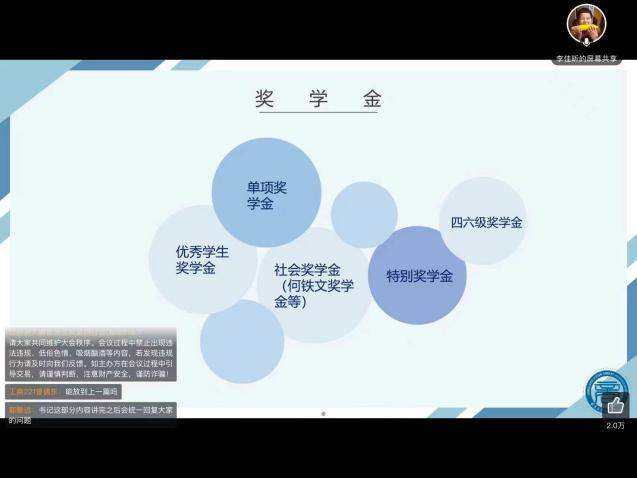 20级辅导员李佳昕老师对学校奖学金制度进行了系统介绍和讲解,逐一介绍了单项奖学金、优秀学生奖学金、社会奖学金、特别奖学金的奖励制度及有关要求。随后,21级辅导员郭建荣老师从档案管理、宿舍及生活管理等方面对新生提出要求,强调了宿舍生活及宿舍文化建设的有关规定,介绍了有关奖惩制度,他谈到,学院对宿舍违纪行为持有零容忍态度,引导新生养成良好的生活学习习惯,共同营造良好的生活学习氛围。