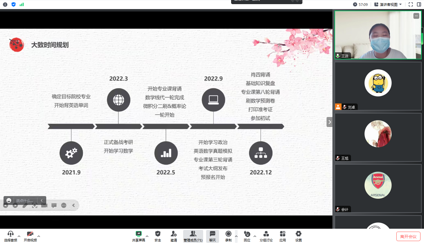 随后,已被第一版主 企业管理专业录取的2023级新生王汲同学进行了企业管理学硕备考经验的分享。她首先介绍了自己的考研初试分数,向大家讲述了自己的考研时间规划,详细说明了数学、英语、政治和专业课这四门学科用到的备考资料、全程跟随的网课老师、备考细节和考研过程中的心态调整等,对自己的考研历程进行了全面的复盘,为有意向报考我院学硕研究生的同学提供了丰富的备考经验。