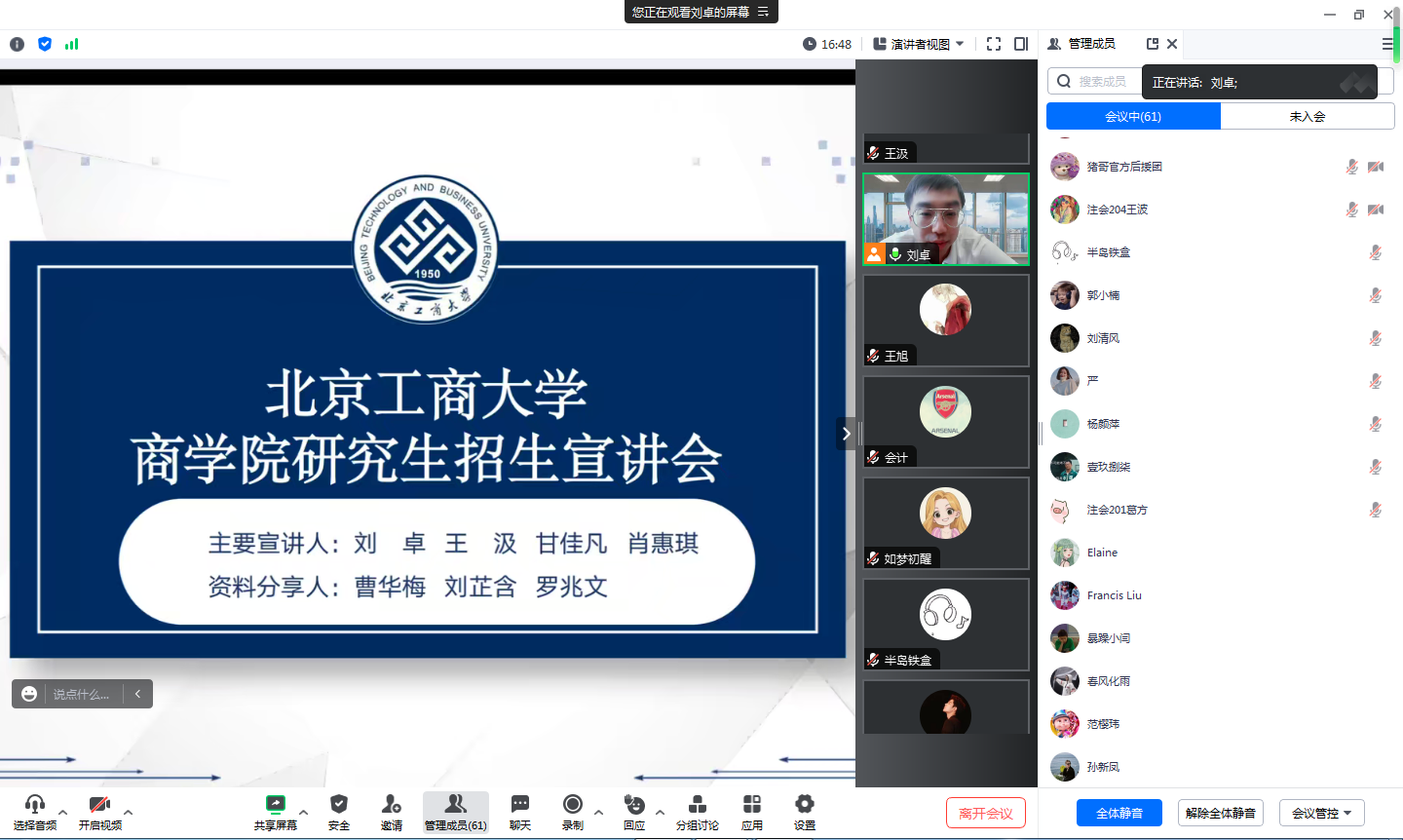 2023年6月21日下午14点,第一版主 采用线上腾讯会议形式组织召开了2024年研究生招生宣讲会。第一版主 招生办公室主任刘卓老师、已被第一版主 录取的2023级企业管理专业新生王汲同学、2023级MPAcc专业新生甘佳凡同学和肖惠琪同学,以及有意向报考我院研究生的学生参加了本次宣讲。本次线上宣讲会吸引了约80名有意向报考我院研究生的同学在线参与,取得了良好的宣讲效果。