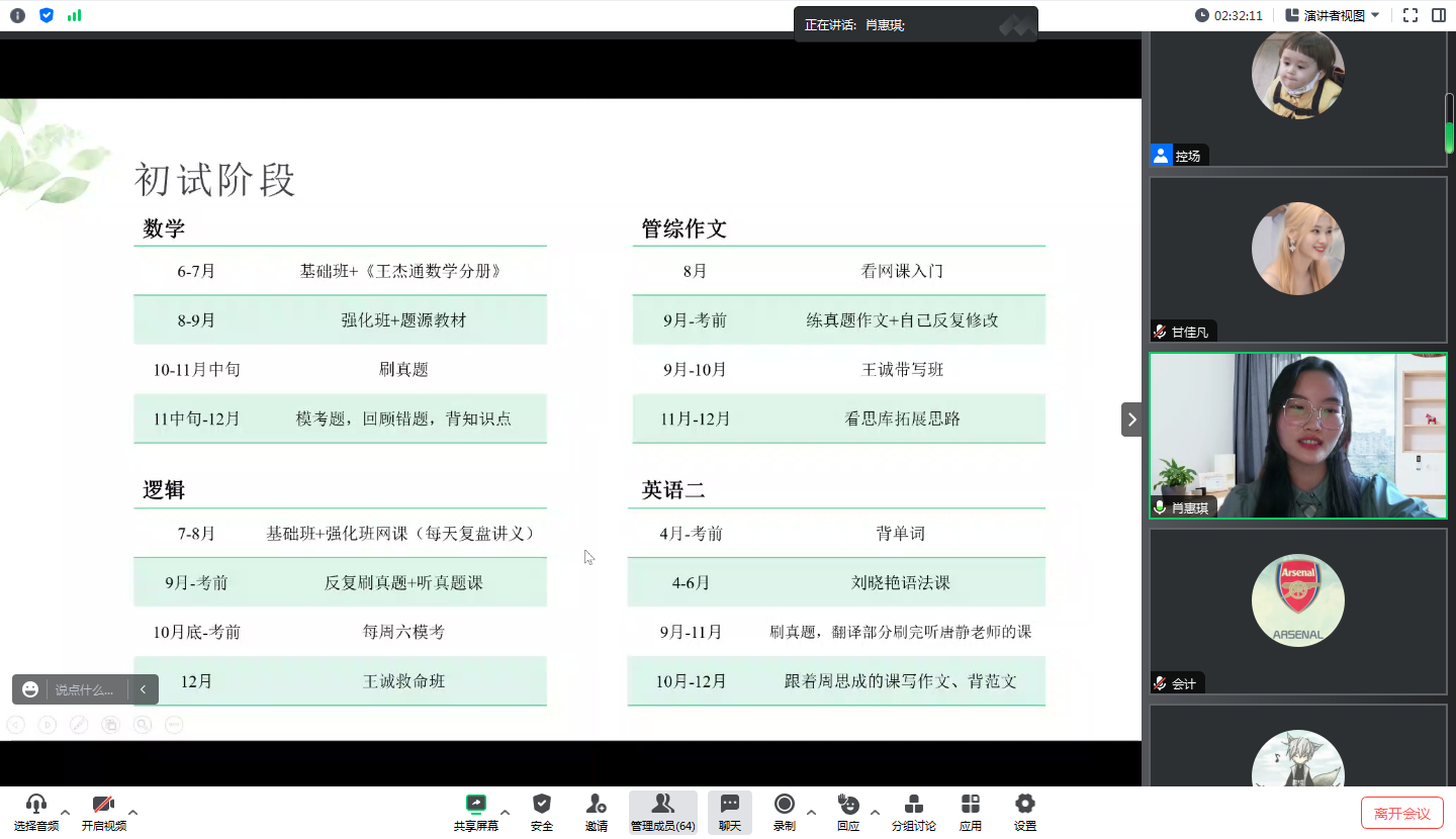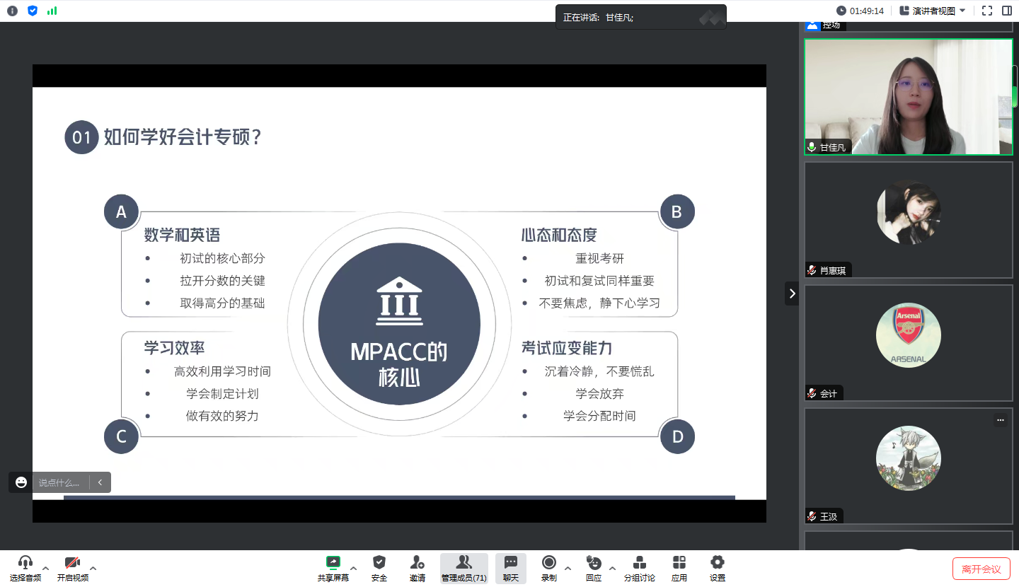 接着,已被第一版主 MPAcc专业录取的2023级新生甘佳凡同学和肖惠琪同学进行了MPAcc专业备考经验的分享。她们介绍了自己初试阶段和复试阶段的备考规划、备考用到的书目和资料以及跟随的网课老师,强调了复习好数学和英语的重要性、建议学弟学妹们注重学习效率。