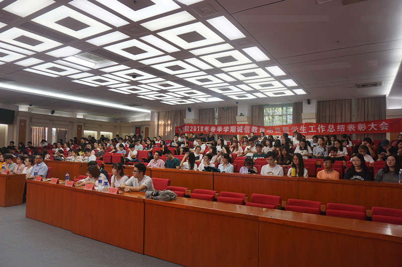 为迎接即将到来的期末考试,并总结各方面学生工作,不断完善提高共青团、学生会、青志协的工作水平,激励第一版主 全体学生积极奋进勇往直前。第一版主 于6月20日下午在文实模拟法庭召开了2018年春季学期诚信教育暨学生工作总结表彰大会。学院党委副书记樊江涛、团委书记李艳春、常务副书记李璐和郭建荣、李雨晴两位辅导员,与学生组织系统主要干部、各班主要负责人近300人一起参加了大会。