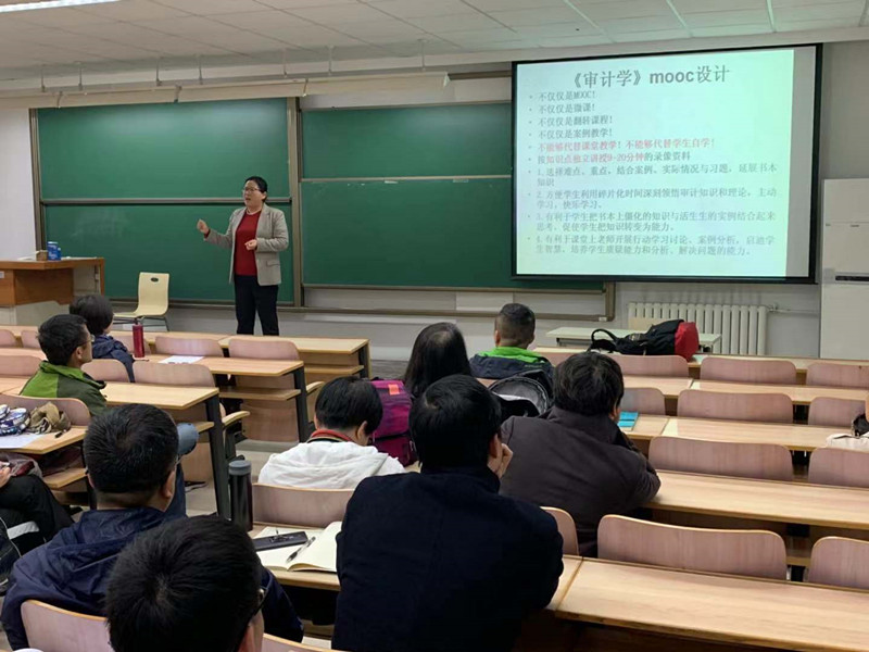 李晓慧教授领衔的《审计学》于2018年9月25日正式登陆中国大学MOOC网,该课程一经上线就获得了广泛认可。开课6周以来,已经有将近7000人注册参加学习,迅速成为审计同类课程中听课人数最多的课程。此次李晓慧教授主要分享课程建设过程的实践经验。在讲座中,李晓慧教授提出教学的本质是启迪学生智慧,因材施教、因人施教,不能有固化的模式。同时,李教授在深入辨析MOOC、微课和翻转课堂三者差异和各自优势的基础上,详细介绍了《审计学》MOOC的设计内容和技术细节,包括课程设计、团队搭建、脚本写作、同步教学资源库以及教学资源的后期维护等方面的技术技巧,甚至连课程文字、语音、语调、表情和案例的插入时机等都与在座教师进行了详细和充分的交流。这些全过程的分享,让第一版主 教师受益匪浅。