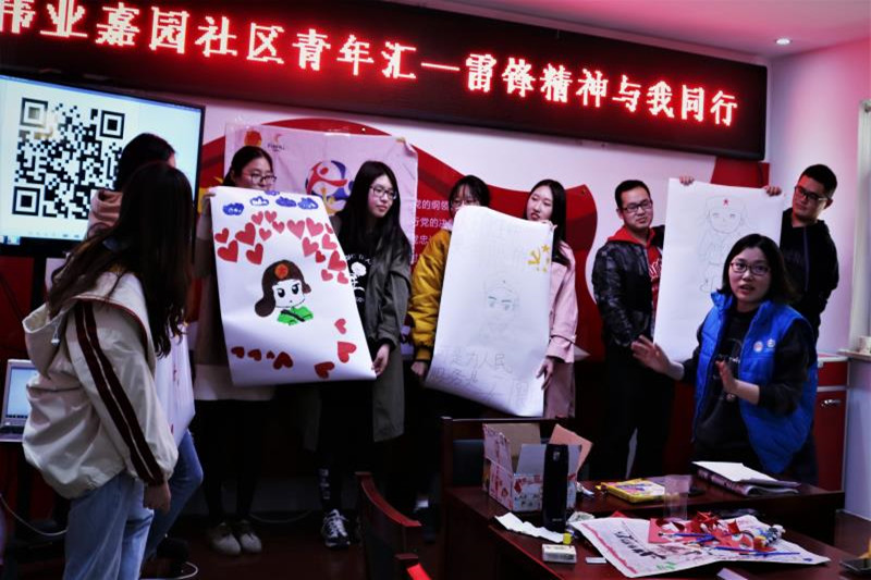 近70名志愿者们分别前往良乡的阳光邑上社区居委会与房山区拱辰街道伟业嘉园参与雷锋志愿活动。初春的寒冷挡不住学生的热情,同学们积极的参与,写下了一句又一句的雷锋名言,画出了一幅又一幅寓意深厚的画作;观看电影《离开雷锋的日子》的同时,同学们纷纷写下了自己的深刻感受;反复吟唱的“学习雷锋好榜样,忠于革命忠于党,爱憎分明不忘本”也使雷锋精神更入人心。团支部还创造性的通过PPT讲解和相关问题抢答的方式来增加同学们对雷锋精神的领悟。