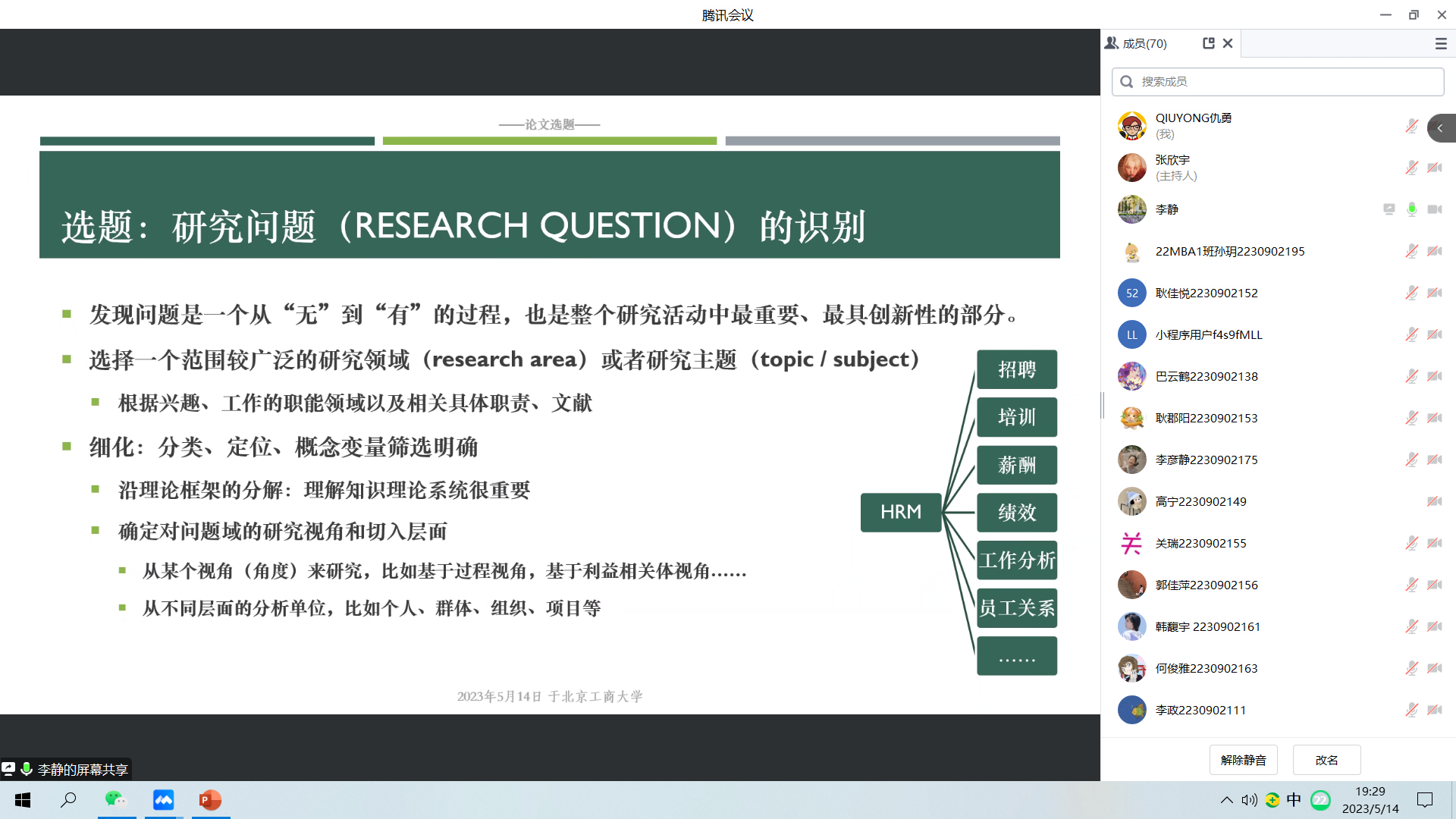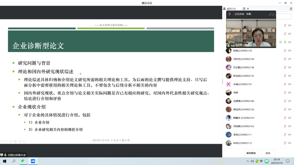 为指导第一版主 MBA专业学生如何明晰选题、规范撰写学位论文,2023年5月14日19:00,第一版主 MBA教育中心举办《学位论文选题与写作规范》讲座,邀请北京师范大学经济与工商管理学院、MBA教育中心李静副主任为同学们指导答疑。讲座由工商管理系仇勇副主任主持,第一版主 MBA中心执行主任何辉以及70余名MBA研究生参加。