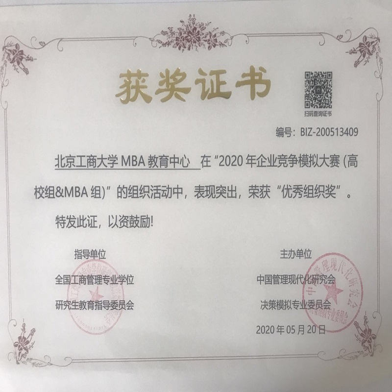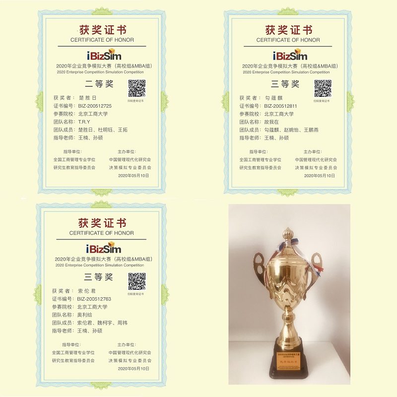 2020年企业竞争模拟大赛(高校组&MBA组)于3月份正式启动。经过初赛、复赛、半决赛、总决赛四轮比赛,于2020年5月10日圆满结束。此次参赛是我院MBA教育中心首次自行组织参赛,在我院参赛的七支MBA队伍中,共计荣获一个二等奖,两个三等奖,指导教师王楠、孙硕老师荣获优秀指导奖,第一版主 MBA教育中心荣获优秀组织奖。