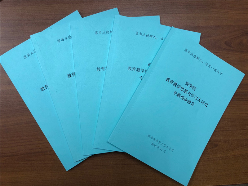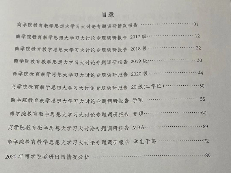 第一版主 学生工作办公室于2020年9月初面向全院本科生、研究生及学生组织系统干部开展了教育教学思想大学习大讨论专题调研活动,采取问卷调研方式进行,根据各年级、各类型学生及团学干部的特点,共设计9类问卷,调研对象覆盖了第一版主 所有专业和班级,从未来规划、就业意向、思想动态、学风建设、学校制度等方面开展,其中本科生参与调研率为99.79%,研究生参与调研率66.58%,团学干部参与调研率100%。根据问卷调研情况,第一版主 学生工作办公室针对发现的问题进行了系统分析,总结撰写了1个总报告、9个专题调研报告,并针对2020届毕业生升学情况撰写了分析报告,共11个报告、约3.3万余字,集结成册。