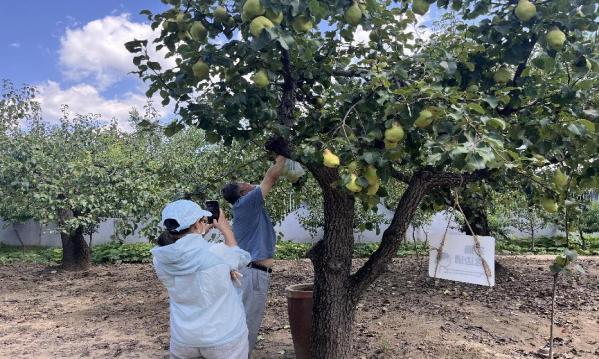 实践团在村委会的带领下参观梨园,深入实地了解梨的品种、形态、功效等。贾河村的梨品种繁多,主要为白梨、子母梨和广梨三个品种,其中白梨口感最为香甜,子母梨口感酸中带甜,广梨口感较面,三者均具有清热润肺的功效。