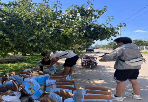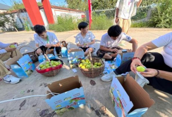 线上,实践团在抖音开展直播活动,打造爆火IP,吸引大批客流,不仅对贾河村京白梨进行了详实的介绍,成功带货卖出了多单白梨,有效提升了村民的销售收入,也在一定程度上提高了贾河村京白梨的网络知名度,为果农进行网络销售打开了局面、做好了铺垫。与此同时,实践团还通过微信等社交平台进行快团团的销售活动,这一形式为不便前来现场又向往白梨好味的广大社会人士提供了极大的便利,取得了良好的效果。实践团成员现场积极帮助果农采摘、包装、打包,并运送到快递站寄出,活动当天共为果农售出梨565斤,3小时创收3109元。