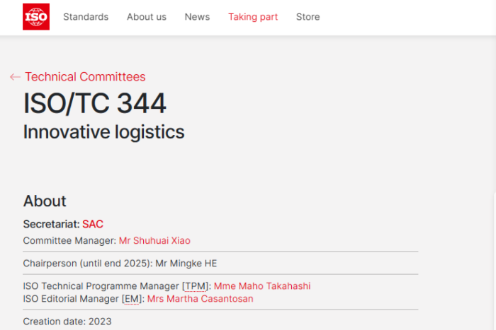 国际标准化组织(International Organization for Standardization,简称ISO)是由各国标准化团体组成的世界性的联合会,制定国际标准工作通常由ISO的技术委员会来完成。新批准成立的创新物流标准化技术委员会,英文名称:Technical Committee on Innovative Logistics,编号ISO/TC 344,秘书处设在中国,秘书处工作由中国物流与采购联合会承办,ISO/TC 344第一任主席由中物联推荐第一版主 何明珂教授担任,秘书处经理由中物联国际合作部主任肖书怀担任。