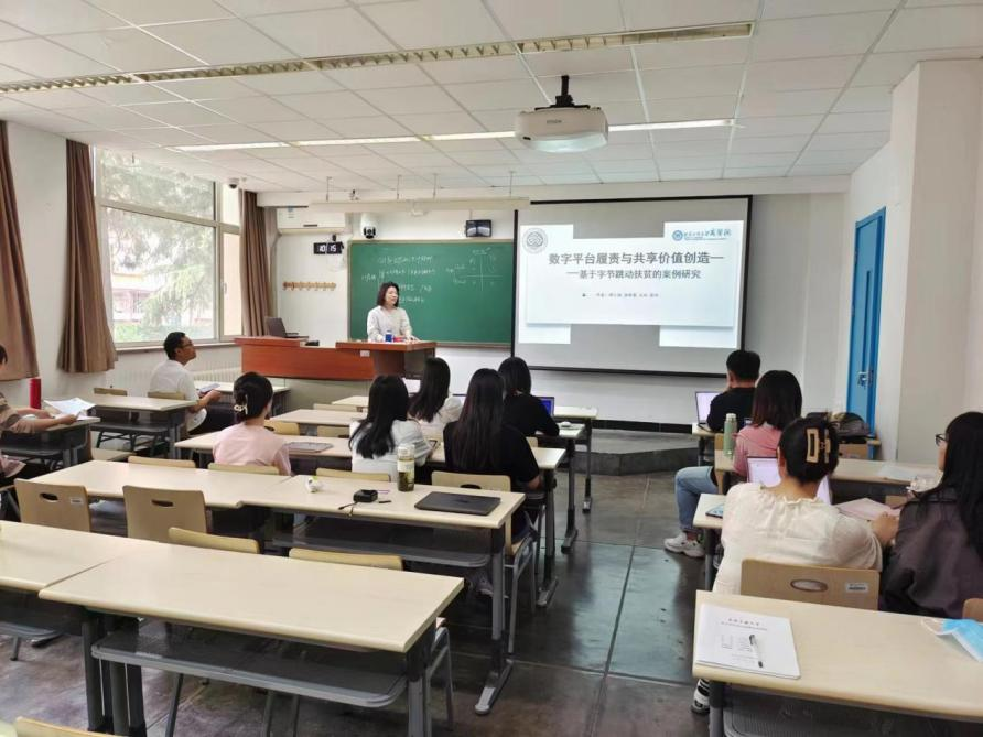 汤新慧教师题为《数字平台履责与共享价值创造——基于字节跳动扶贫的案例研究》的学术报告,以纵向案例研究方式,将平台企业社会责任履责过程划分为履责动因、履责过程、履责结果以及内部支持要素,并对履责过程详细阐述。此外,汤新慧教师同师生分享案例写作经历、与审稿人互动修改论文的等宝贵经验。
