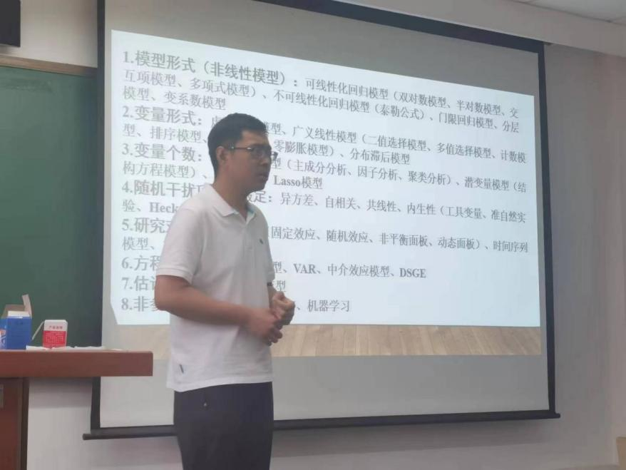 王康教授以数理统计方法为基础,基于问题、模型、数据三种视角下,为参会师生汇总统计学与经济学常用模型,并系统介绍经济学和管理学热门研究方法,如PSM-DID、GMM等。随后,王康教授分享了其团队于《管理世界》《统计研究》等核心期刊发表的多篇论文,为参会师生详细说明数理统计在管理学研究领域中的具体应用情境与过程。