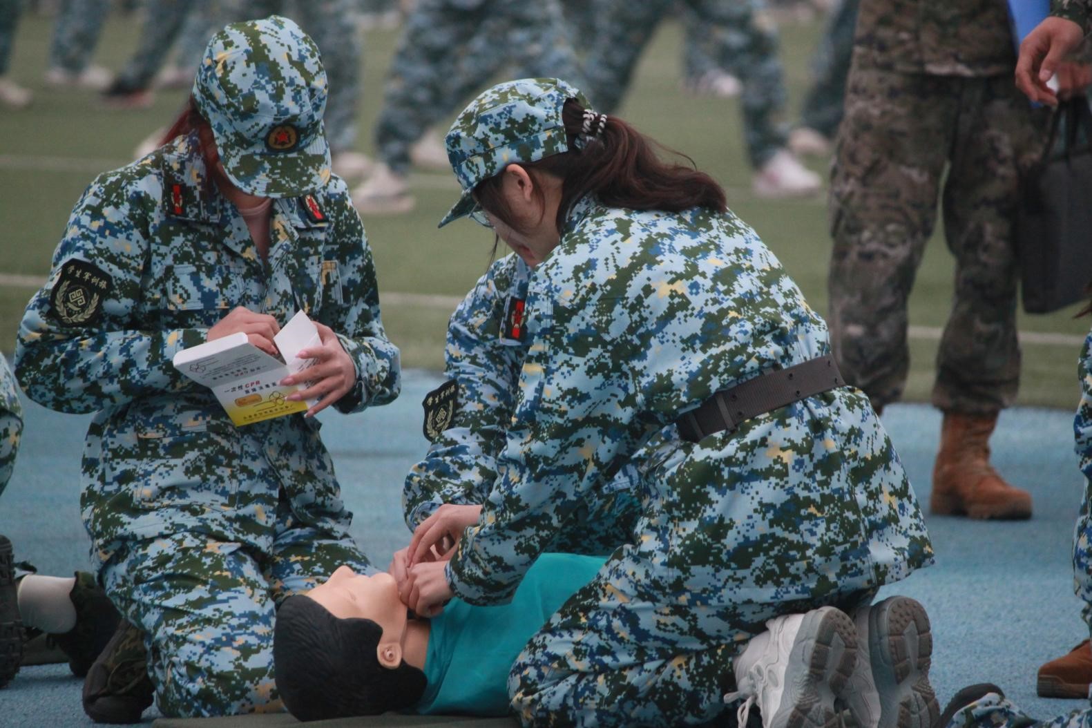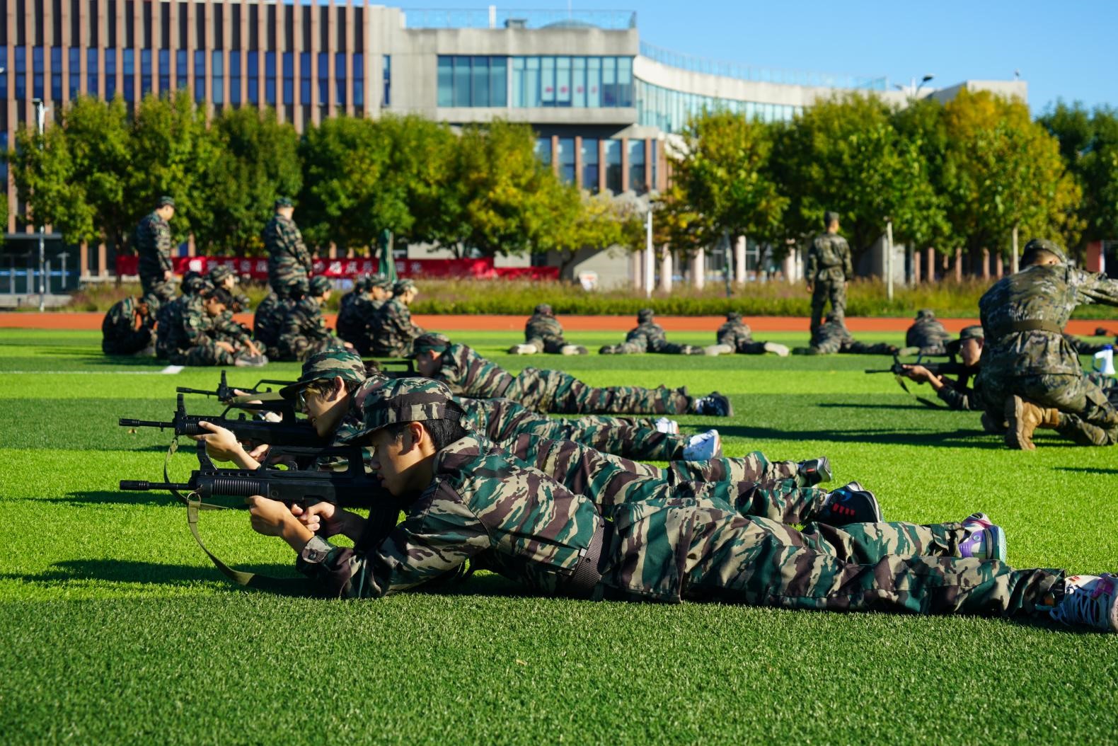 军训中期,同学们进行专项训练,练齐步、学射击、习招式、研救援。拿起枪支体验⼀次打靶,这无疑是大家最激动的时刻。扛起枪,站立、半蹲、卧倒,展现商院学子飒爽英姿。