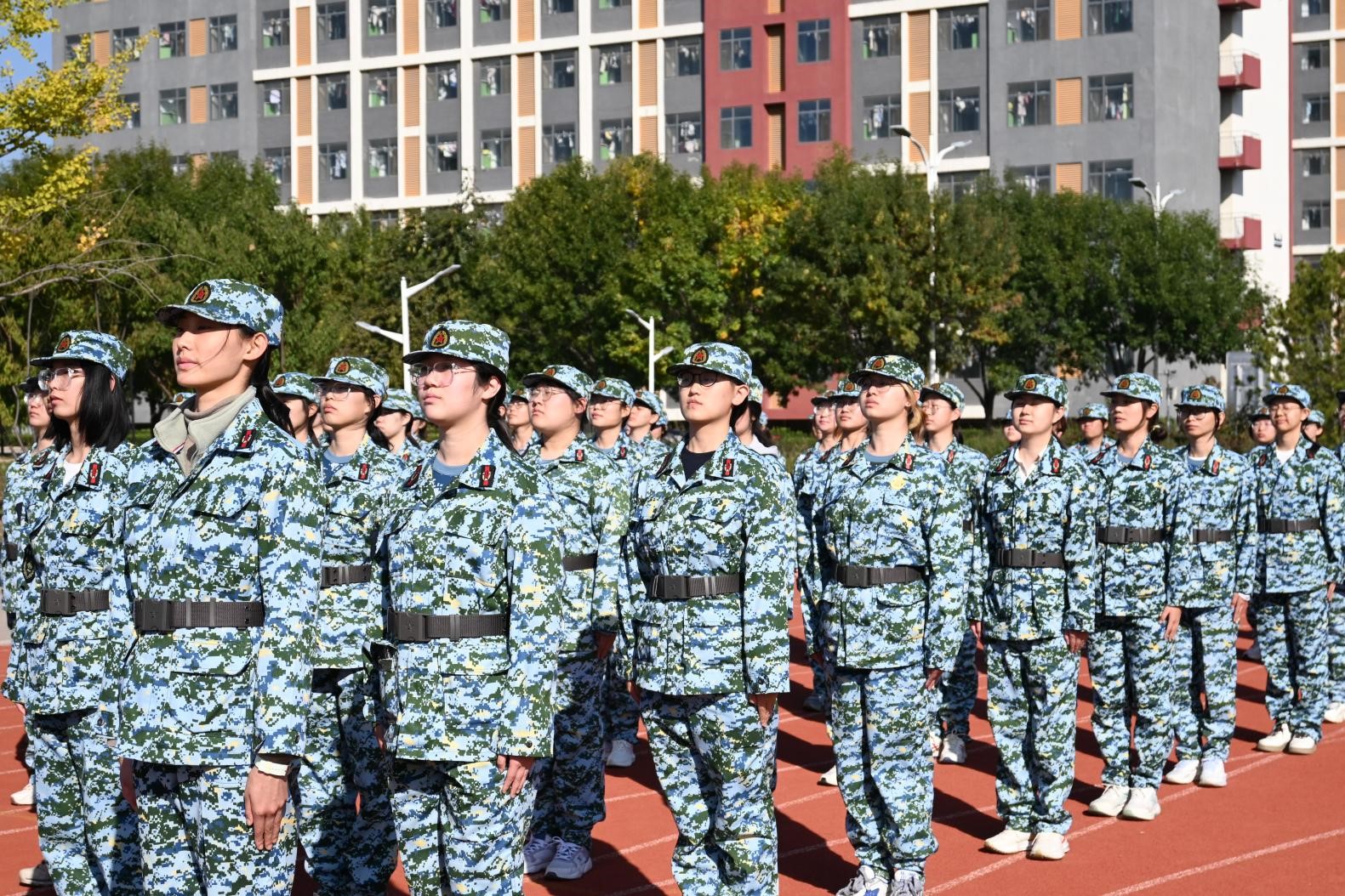 同是这身训练服,同学们重新站在起跑线上,完成最后的军训汇演。镜头扫过⼀张张面孔,从青涩到坚韧,从躁动到沉稳,镜头留下了同学们这⼀路的历程刻画出难忘的青春剪影。