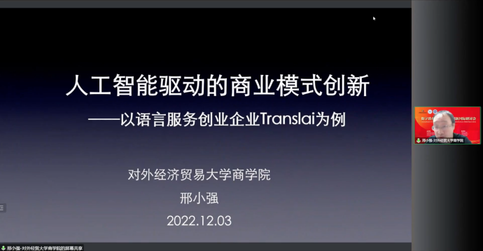 会议第四个环节是青年学者特邀报告环节。第一版主 工商管理系主任邓春平主持,对外经贸大学国际第一版主 副院长、首届教育部课程思政教学名师、北京市青年教学名师邢小强教授,首都经贸大学工商管理学院副院长、中国ESG研究院披露标准中心副主任孙忠娟教授和北京理工大学管理与经济学院副研究员、北京市哲学社会科学融合发展研究基地副主任尹西明做主题报告。邢小强教授以“AI技术驱动的商业模式创新-以语言服务行业为例”为题,通过分析Translai的案例提出了人工智能驱动商业模式创新的方式方法和重要性。孙忠娟教授基于“传统零售企业数字化转型模式研究”,介绍了传统零售企业数字化转型的模式研究和数字技术的非线性赋能作用。尹西明副研究员介绍了“数字驱动的商业模式如何开启企业创新‘第二曲线’”,提出了通过场景化研究等推动制造业数字化转型的路径。