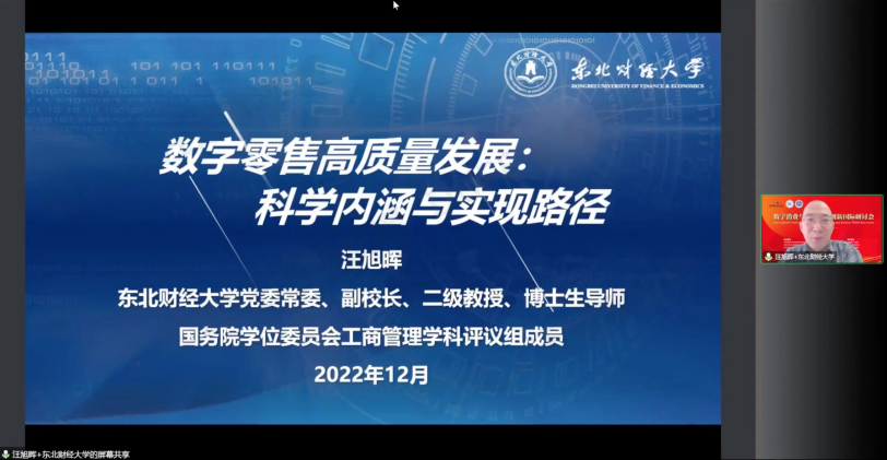 首都经济贸易大学工商管理学院院长、中国ESG研究院执行院长、中国消费大数据研究院院长柳学信主持,东北财经大学副校长、国务院学位委员会工商管理学科评议组成员汪旭晖教授和四川大学特聘教授、国家杰出青年科学基金获得者余乐安教授作主题报告。汪旭晖就“数字零售高质量发展:科学内涵与实现路径”进行了讨论,从数字零售的角度,解读了数字经济和工业经济的不同之处,提出未来发展中数字化转型所面临的挑战。余乐安以“基于大数据的零售业价值测度研究”为题,基于对中石油的案例分析深入地介绍了商品价值测度、消费者价值分类和测度等内容。