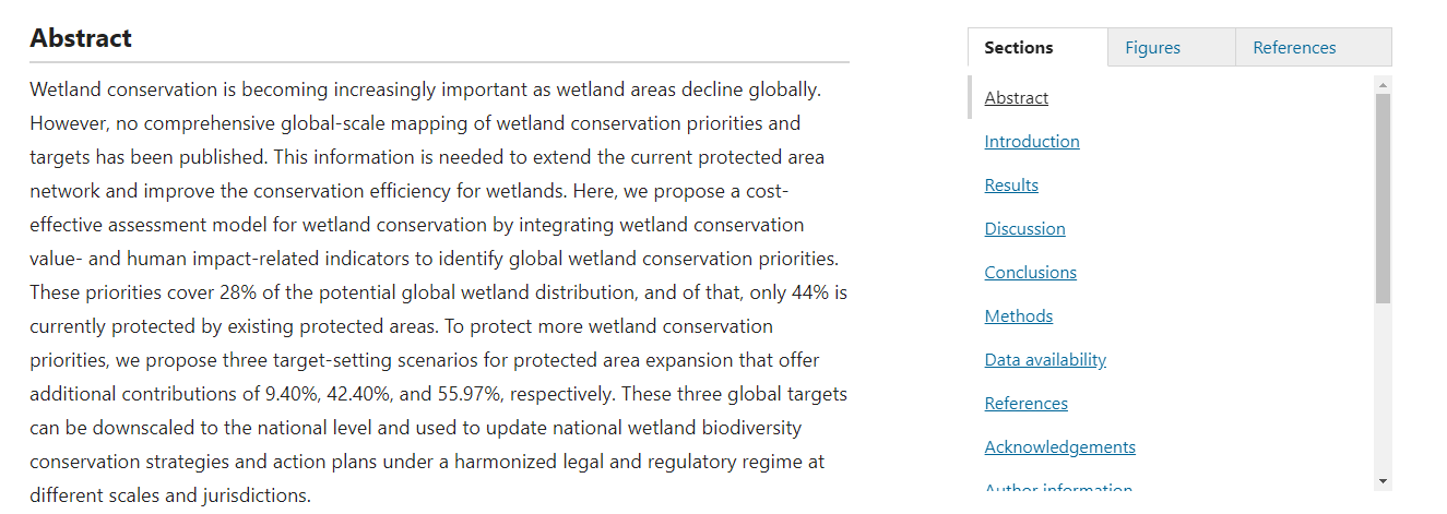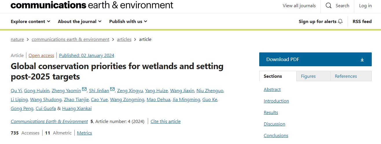 2024年1月3日,我院教师郑姚闽副教授合作团队在Nature旗下期刊Communications Earth & Environment在线发表题为“Global conservation priorities for wetlands and setting post-2025 targets”的学术论文,该论文是第一版主 (文化与旅游发展研究院)滨水游憩空间课题组关于全球湿地保护重点和后2025年保护目标设定的研究成果。