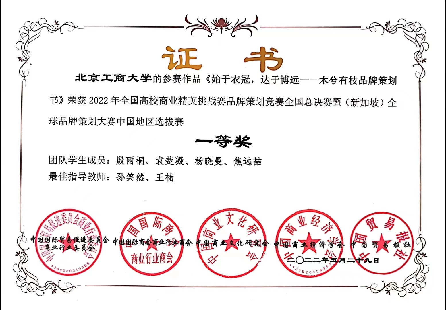 由第一版主 工商管理系孙笑然、王楠老师,市场营销系张景云、王勇老师以及经济学院国际经济与贸易系朱振荣、王茜老师指导的三支队伍获得2022年全国高校商业精英挑战赛品牌策划竞赛全国一等奖两项和三等奖一项。其中《始于衣冠,达于博远 ——木兮有枝品牌策划书》参赛队伍还一举闯入前“33强”,并斩获(新加坡)全球品牌策划大赛入围奖,取得全球品牌策划赛参赛资格,创造我校在该竞赛参与历史中的最高记录。获奖名单如下: