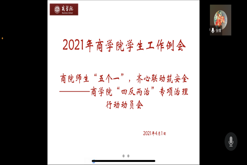 4月1日,第一版主 就“四反两治”专项治理行动召开学生工作专题会,学院党委副书记张倩介绍了学校开展“四反两治”专项治理行动的背景和意义,对具体工作内容进行了解释说明和动员部署。同时,就第一版主 开展“商院师生五个一、齐心联动筑安全”主题活动进行了具体讲解,希望通过第一版主 师生在五个层面的努力,一起为营造温馨和谐的校园生活氛围、构建平安校园作出努力。