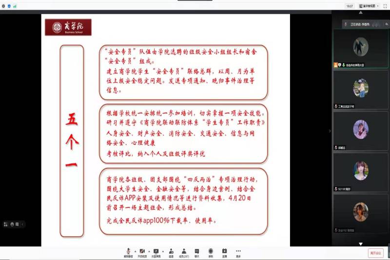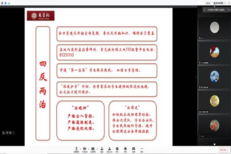 4月2日中午,第一版主 学生工作办公室面向270余名学生安全专员开展了线上动员会。参会的学生安全专员是由学院选聘的班级安全小组组长和宿舍“安全专员”组成,学生工作办公室全体教师参会。会议开始,由第一版主 辅导员李嘉伟老师为良乡校区安全专员队伍就第一版主 “四反两治”专项治理行动方案进行了解读,对学院拟开展“五个一”行动做了具体说明,即:建立一套联动机制、掌握一项安全技能、召开一场主题班会、讲述一个反诈案例、增强一份安全意识;并对学校近期开展的具体暖心措施特意进行了说明。第一版主 党委副书记张倩总结讲话,她指出,第一版主 是学校“大家”的重要组成部分,师生要齐心协力,努力营造安全、温馨、幸福的学习生长环境;希望学工团队和学生安全专员要高度重视、提高警惕、增强安全意识;要通力合作、严格落实、构筑平安校园;要师生联手、同向发力、守护校园安全。