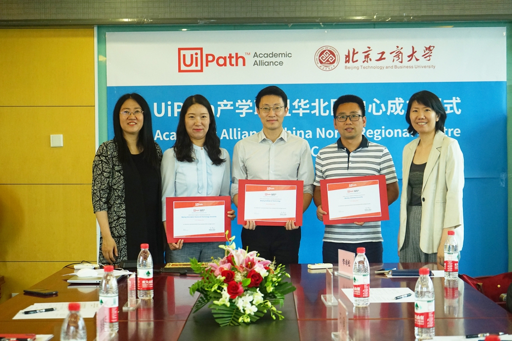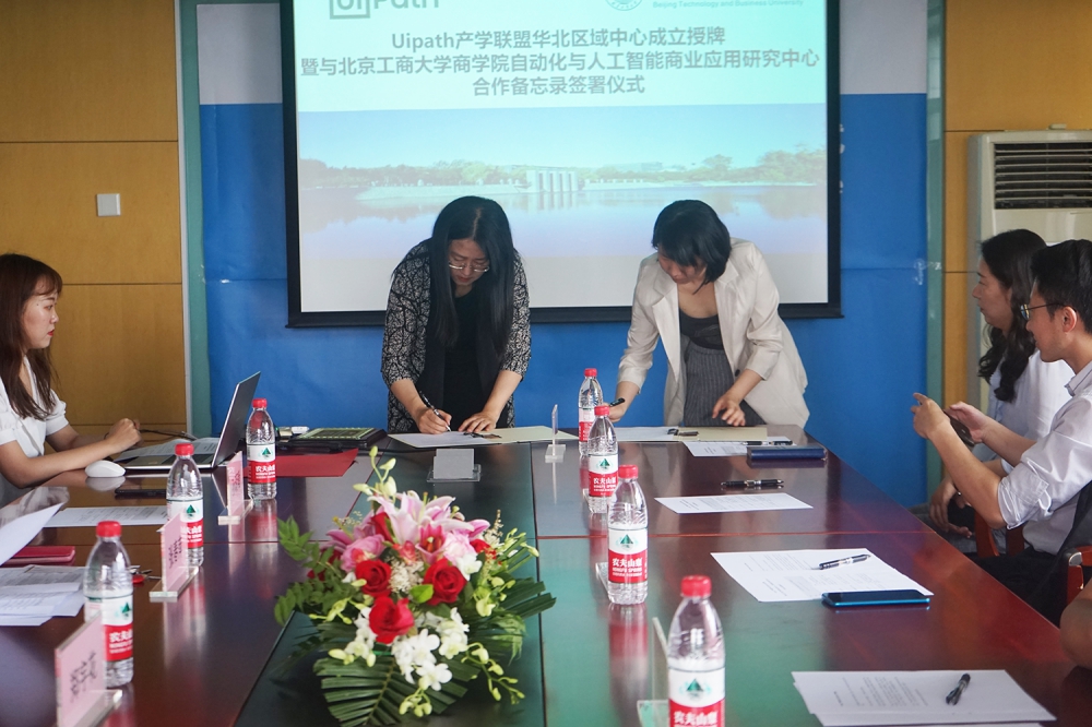 UiPath产学联盟负责人石小萌为自动化与人工智能商业应用研究中心主任孙玥璠进行了授牌,并宣布UiPath产学联盟华北区域中心成立。随后,双方签署了《UiPath产学联盟与第一版主 自动化与人工智能商业应用研究中心战略合作备忘录》,双方将在建立RPA人才培养基地、培养和提升学生RPA专业技能、组织开展多种形式的行业人才交流、竞赛及招聘等方面展开密切的合作。
