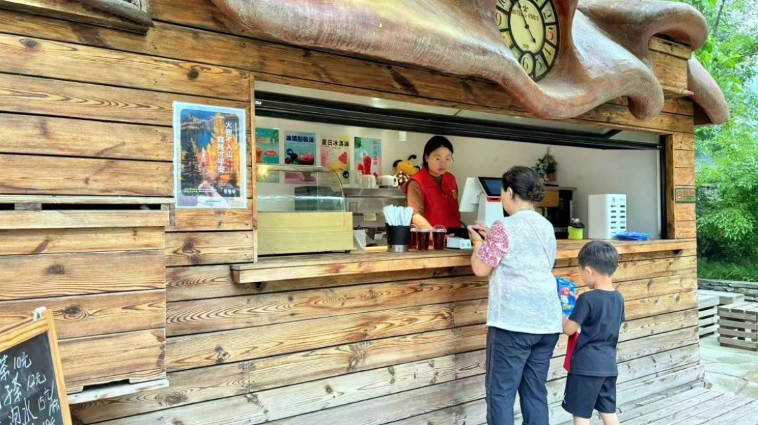 红色背篓餐饮部特色摊位前,商科智慧闪耀田间地头。学子们娴熟收银、热情推介,将山楂汁、豆腐等黄山店“山野风味”。