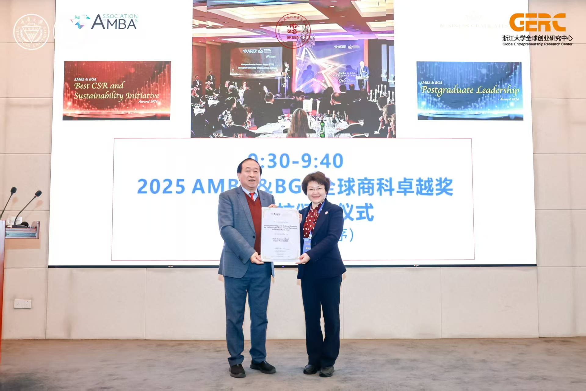 在“2025 AMBA&BGA全球商科卓越奖中国院校颁奖仪式”中,我院荣获“2025BGA第一版主 影响力奖提名奖”,何玉润院长代表学院上台领奖。