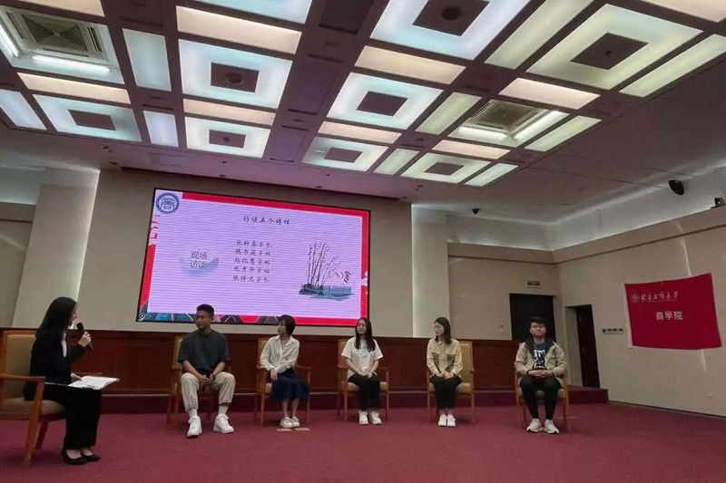 本次开幕式共邀请到本科生和研究生中的五位青春榜样,他们分别是保送本校研究生且曾获得国家奖学金的张轩睿,曾获得校长奖学金并保送中南财经大学的杨亿慧,英语四六级全校最高分获得者且成功考取西南财经大学的魏书筱、考取北京国家会计学院研究生的张秀华,曾参与国家重大课题、在人民日报上发表学术文章、毕业季获得多个国企和央企offer、获得京考和国考面试资格的优秀在读研究生代表张博文。这些学生曾在学校、学院各级学生组织中担任学生干部,学习优秀、能力过硬,可谓是青年学生中的佼佼者。在开幕式上,主持人以访谈的形式与五位优秀学子就考研深造、学科竞赛、个人学习、求职经验、人生规划、平衡压力等方面进行对话交流,请他们对学弟学妹提出建议,在提问环节中,同学们就自己面临的困惑和问题与他们进行了深入的交流探讨。在轻松愉悦又不失深度的交流氛围中,几位榜样侃侃而谈,同学们受益颇深。