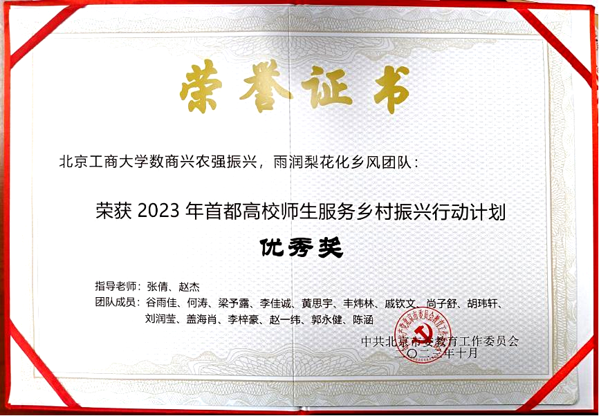 我校该获奖项目自立项起,按照项目计划认真执行,线上线下相结合广泛开展社会调研和实践。以具备多年合作基础的北京市房山区琉璃河镇贾河村为实践目的地,围绕“产业振兴、数商兴农”“文化振兴、文明乡风”两条主线,致力于通过实地调研、电商营销、人员培训、采摘节筹办、营造梨花节热点、设立社会实践基地、拍摄贾河村京白梨宣传片、设计文创产品等多环节积极开展专题社会实践,为传统白梨销售打开新思路,为梨文化传播带来新气象,在助力京郊农村发展建设的同时致力于实现学生成长发展、商科人才培养多赢的格局。该项目在实践过程中,展现出我校师生心系家国、服务首都、立足实践、贡献才智的良好风貌。另悉,该项目在2023年首都高校师生服务乡村振兴行动计划中荣获优秀奖。