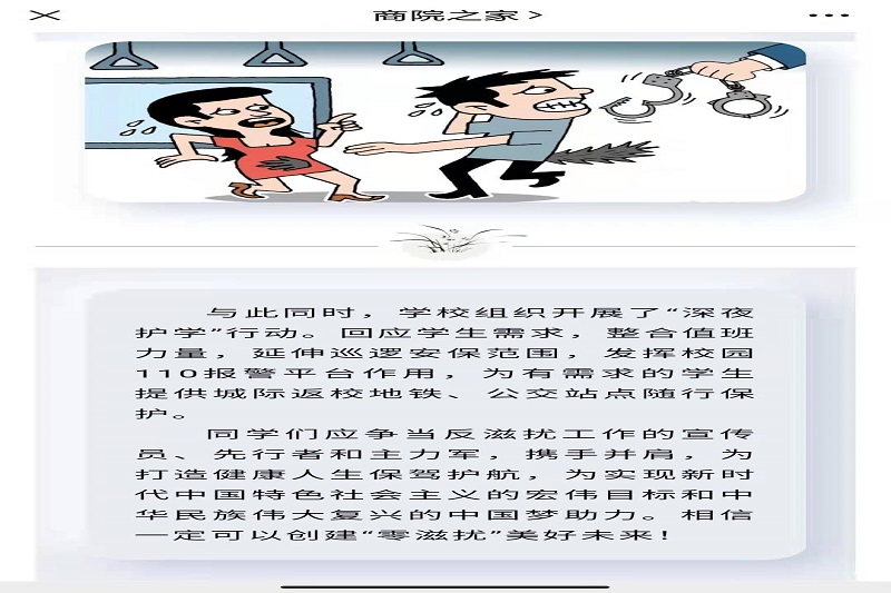 结合近期学校开展的“四反两治”专项治理行动,第一版主 按照各项治理工作通过“商院之家”进行了详细的整理和推送。针对“反伤害”发布了“遇事冷静面对,抵制校园暴力”;针对“反诈骗”发布了“提高防范意识,谨防上当受骗”;针对“反偷盗”发布了“居安思危、警惕偷盗”;针对“反滋扰”发布了“安全意识不可少,共建美好北工商”。通过这些文章进一步引导同学们增强安全意识,师生联手构建和谐幸福的校园。