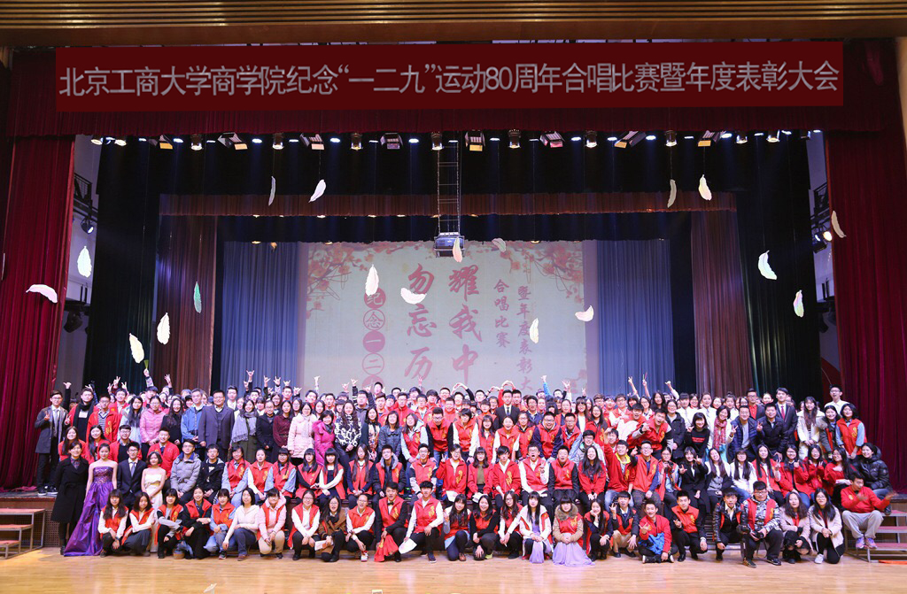 在良乡校区举办纪念“一二•九”运动80周年合唱比赛暨年度表彰大会。学院党委书记欧阳爱平、副书记樊江涛,校团委书记王海伟,校合唱团指导老师赵梦弦,校舞蹈团指导老师王凌焱,班主任、辅导员与大一新生共六百余人参加大会。