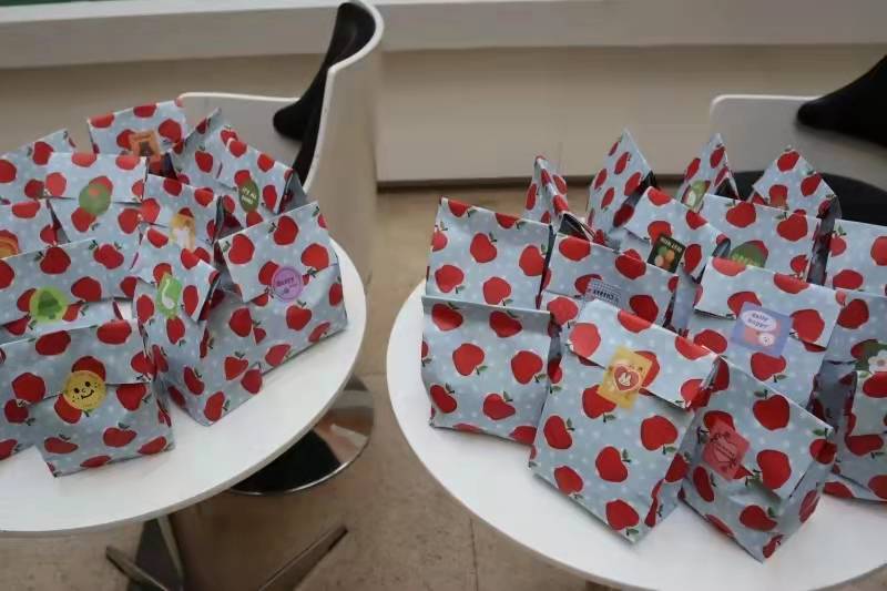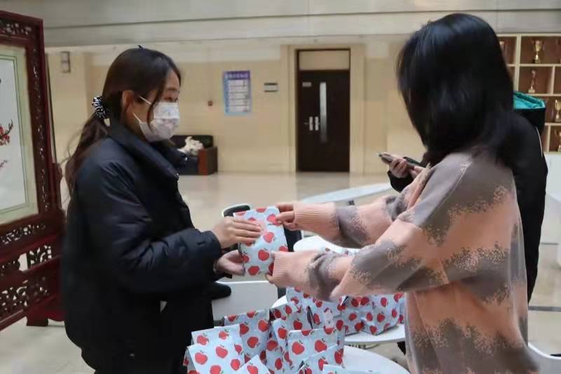 在考研学子们仍在抓紧最后的时光紧张复习之际,第一版主 心资部的同学们早早来到商楼大厅为家庭经济困难的考研学子们精心准备小礼袋。画满红苹果的蓝白相间小礼袋里装着又大又红的苹果和一张满载着祝福语的卡片。苹果有着放“苹”心态、“苹”稳上岸、一定能“果”线的寓意,寄托着学弟学妹们对考研学子的祝福;卡片上写有大家精心准备的鼓励话语,言语间希望这些考研的学长学姐们能摘取胜利的桂冠,不负过去伏案桌前、泛舟书海的自己。