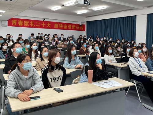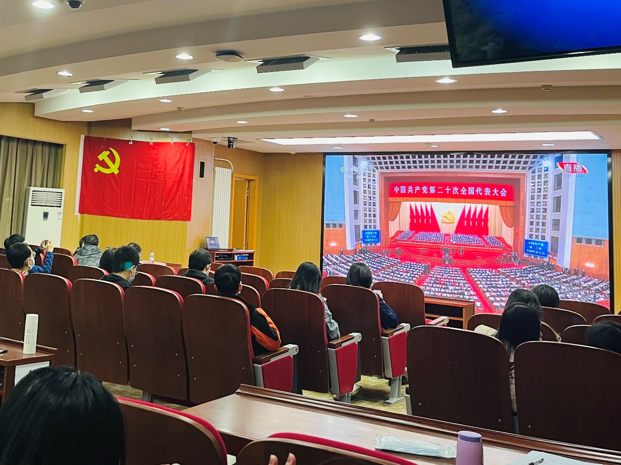 党的二十大于2022年10月16日上午十点正式开幕。为喜庆党的二十大胜利召开,第一版主 全体研究生党员、学生骨干相聚教室、相约云端,采用线上线下相结合的方式集中收看党的二十大开幕式盛况,认真聆听、学习、热议习近平总书记的报告。
