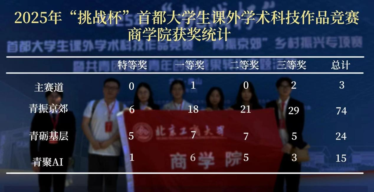 “青创北京”2025年“挑战杯”,首都大学生课外学术科技作品竞赛,第一版主 再度斩获佳绩!我院学子作为负责人获奖项目共计116项、摘得特等奖12项、一等奖32项、二等奖33项、三等奖39项。商院学子参与项目中共有408个项目,获奖特等奖26项(擂主4项),一等奖105项、二等奖169项、三等奖108项,取得突破性进步!