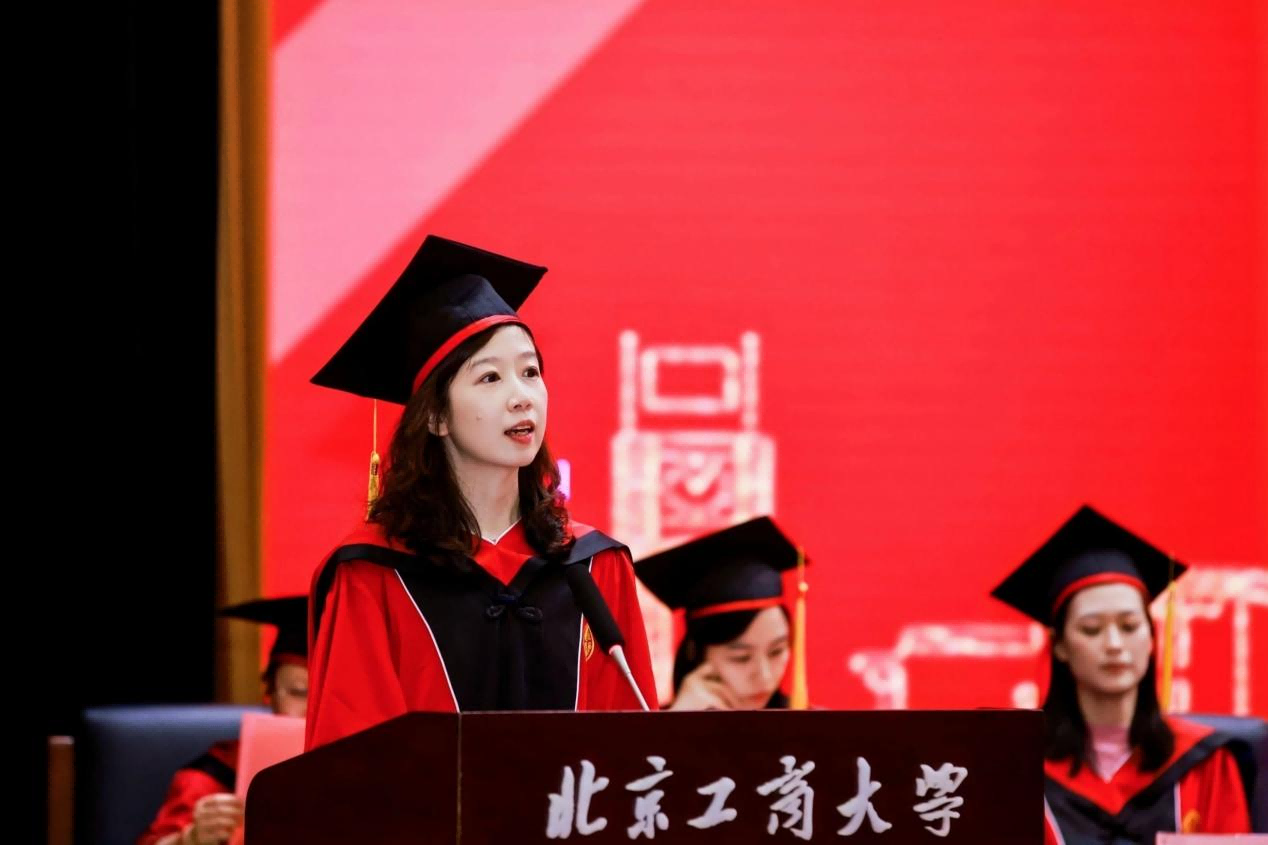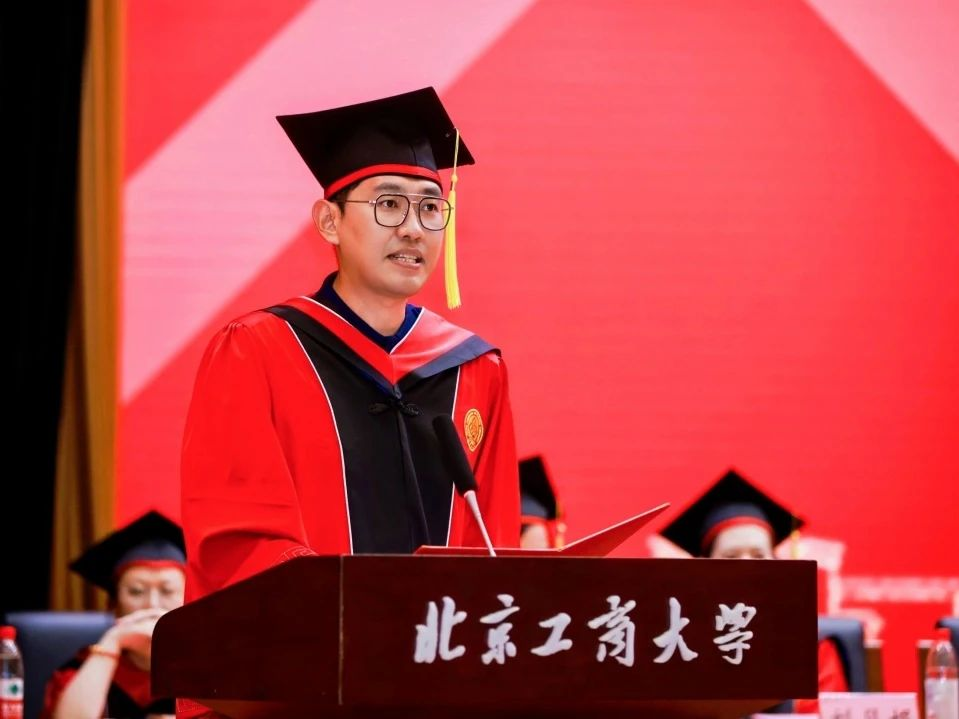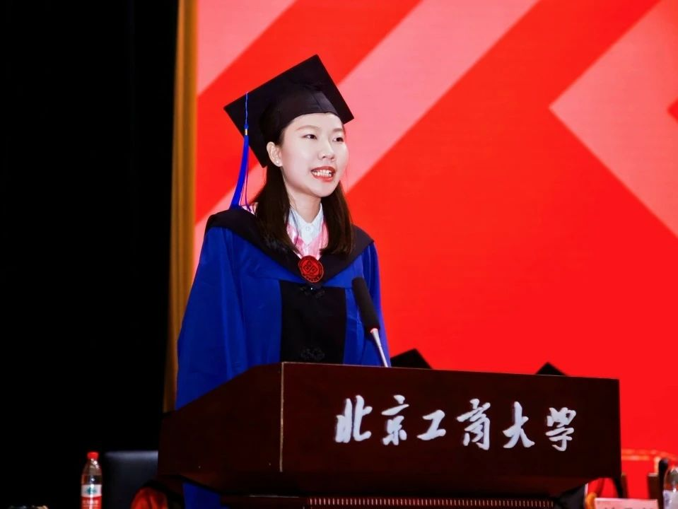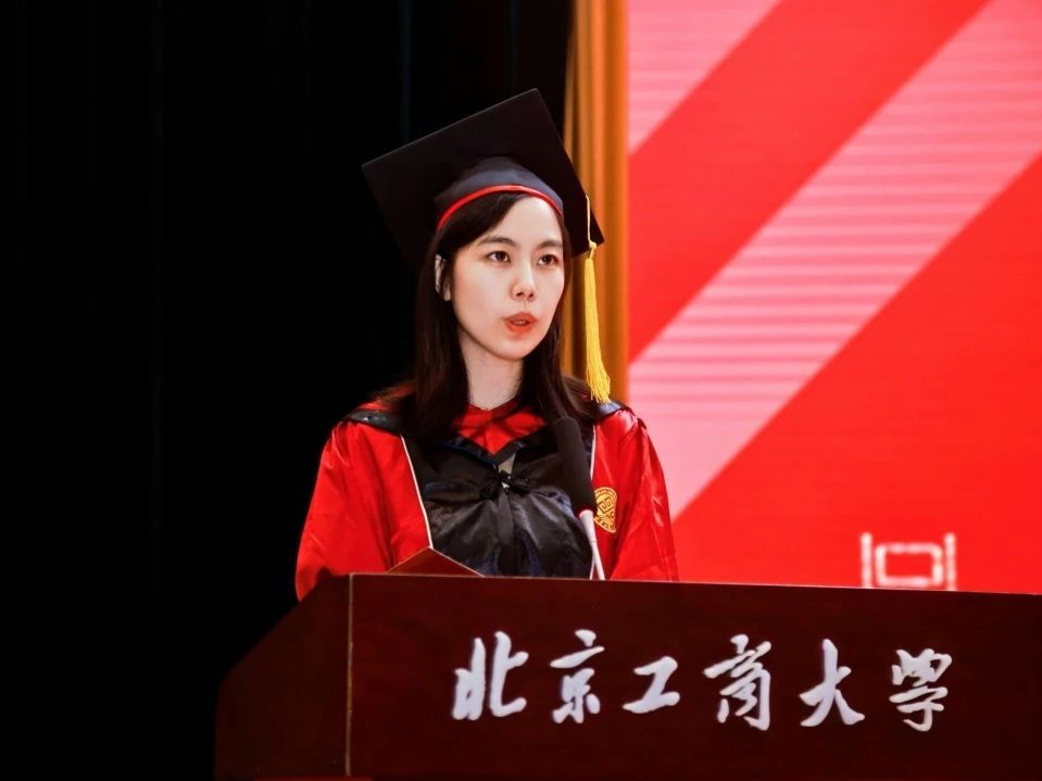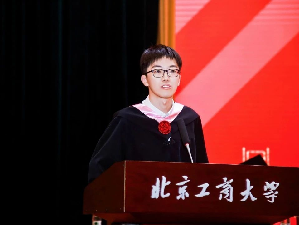 本科生毕业生代表苏柯木分享了四年的共同成长与集体记忆。他回顾了与学院共进的时光,亲历校园解封、智慧教室升级等变革,也见证了“工商一体”理念的深化。面对求学路上的试炼与选择,他坚定地强调所有经历都沉淀为北工商赋予的独特底气,此刻拥有的不仅是青春年华,更是面向未来的自信目光。他代表全体本科毕业生感恩母校与师长的培育,坚信前路无论坦途或曲折,都将带着这份积淀勇敢前行,拥抱无限可能。
