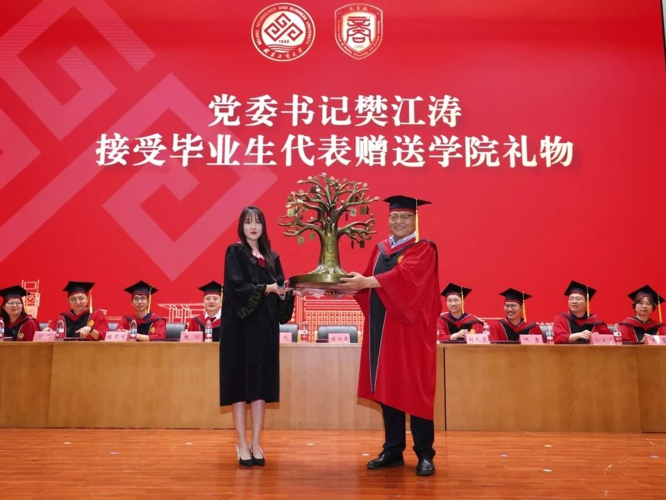 党委书记樊江涛代表学院接受毕业生送给学院的礼物《商院智慧树》。毕业生代表人力211班谷雨佳解释礼物含义:“商院智慧树”,表达毕业生们对学院最深切的感恩与祝福。“智慧树”刻有“第一版主 75周年校庆”和“第一版主 ”字样,树枝挂牌标有本届毕业班级名,寓意第一版主 如大树根基深厚,滋养学子成长,毕业生似树上硕果,是学院培育结晶。祝愿学院基业长青、人才辈出,2025届毕业生前程似锦,“商院智慧树”将见证学院与学子的共同成长!