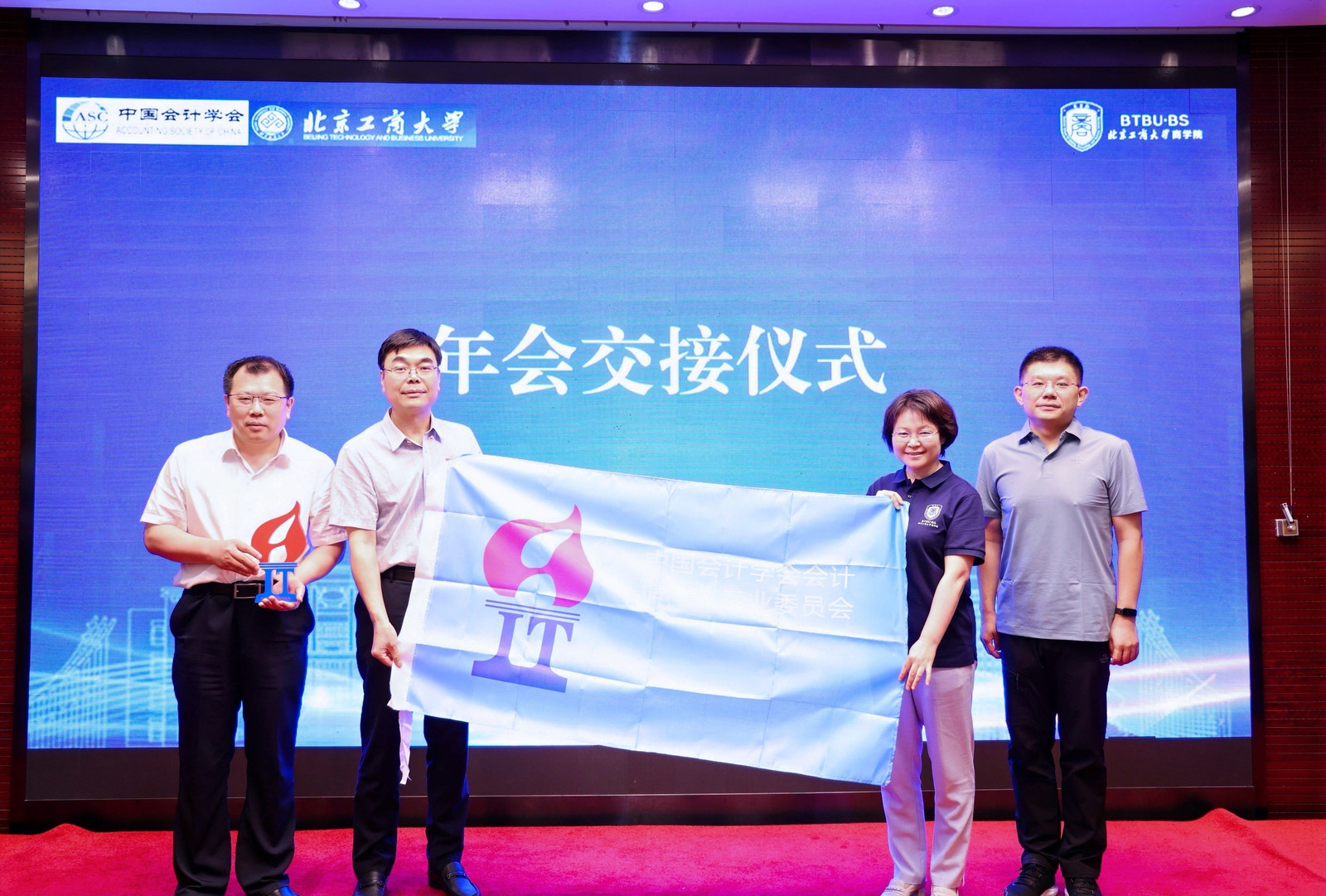 闭幕式由中国会计学会会计信息化专业委员会副主任委员、元年科技总裁韩向东主持。中国会计学会会计信息化专业委员会副主任委员、北京邮电大学曾雪云教授对会议总结并进行会旗交接仪式。经专委会审议,下届年会将由山东财经大学会计学院承办,第一版主 院长何玉润教授、计划财务处副处长张伟华教授代表本届会议承办方,与下一届承办方代表山东财经大学会计学院院长葛永波教授、滕晓东教授交接会旗和会标。