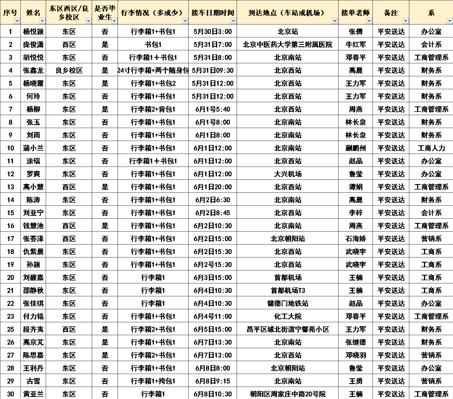 此次活动采取“订单征集—预约接单”模式进行师生需求匹配。截至6月10日,超过有20余名教师应征报名,30名同学提交“用车订单”并被老师们暖心安全送达目的地。无论是北京西站、北京南站还是距离超过50公里的大兴机场,也不论是阜成路校区还是良乡校区,更不论是凌晨、午后还是夜晚,均有老师默默填表、及时“接单”,尽心尽力护送学生一路周全。